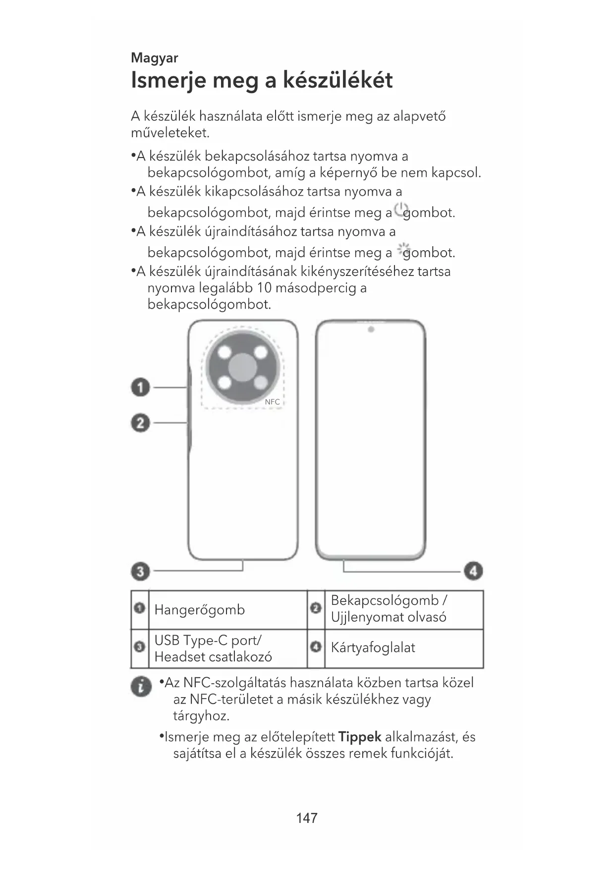 - A készülék újraindításának kikényszerítéséhez tartsa nyomva legalább 10 másodpercig a bekapcsológombot. NFC Hangerőgomb Bekapcsológomb / Ujjlenyomat olvasó USB Type-C port/ Headset csatlakozó Kártyafoglalat