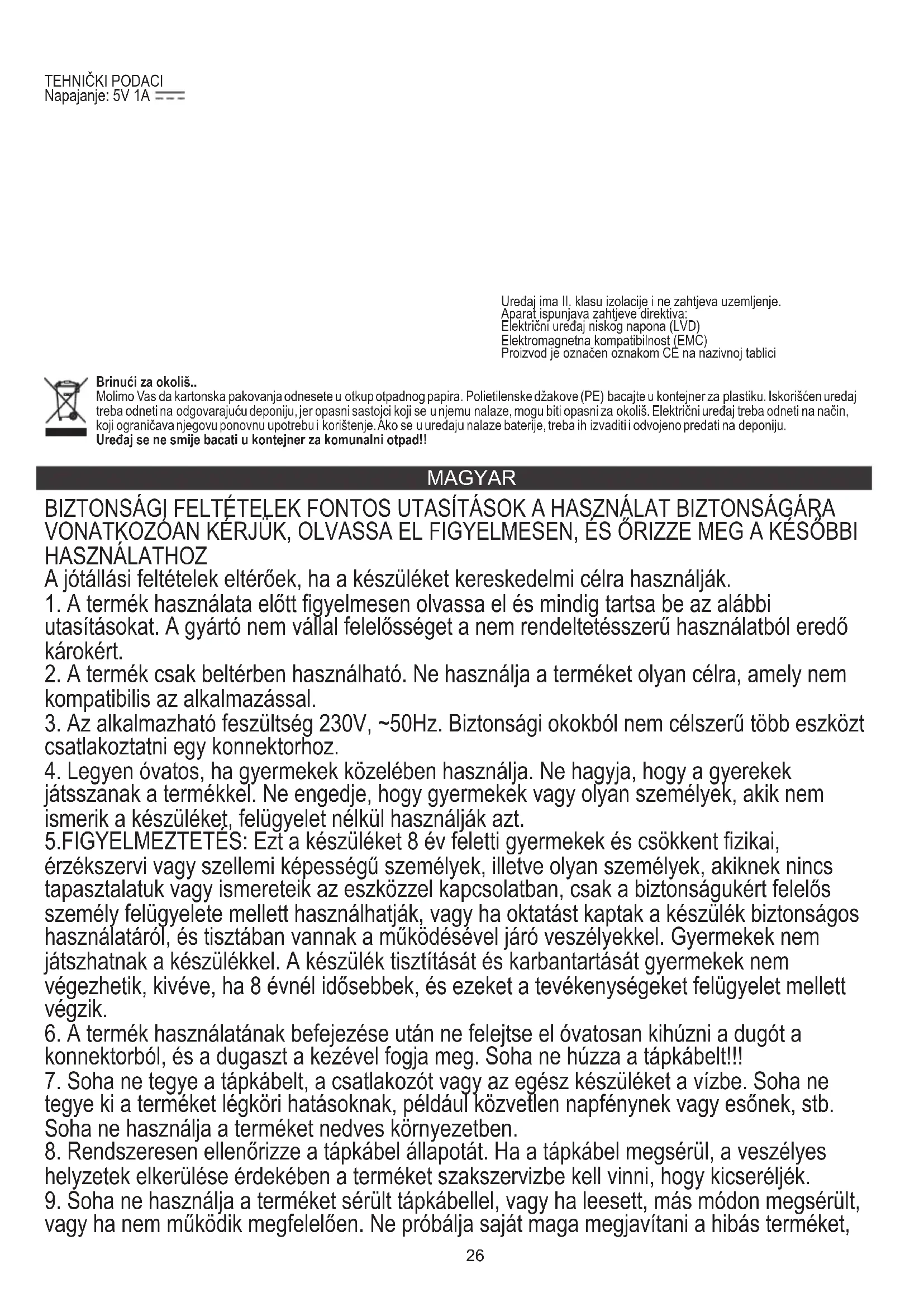 Tápellátás: 5V 1A A környezet védelme érdekében kérjük külön karton dobozok és műanyag zsákokat és dobja őket a megfelelő hulladék közé. Használt készüléket kell eljuttatni a kijelölt gyűjtőhelyekre miatt veszélyes elemek alkatrészeket, amelyek hatással lehetnek a környezetre. Ne dobja a készüléket a közös szemétkosárba. A berendezés II. szigetelési osztály szerint készült, nem igényel földelést. A berendezés megfelel a következő direktíváknak: Kisfeszültségű elektromos berendezések (LVD) Elektromágneses kompatibilitás (EMC) A termék CE jelzéssel van jelölve az adattáblán