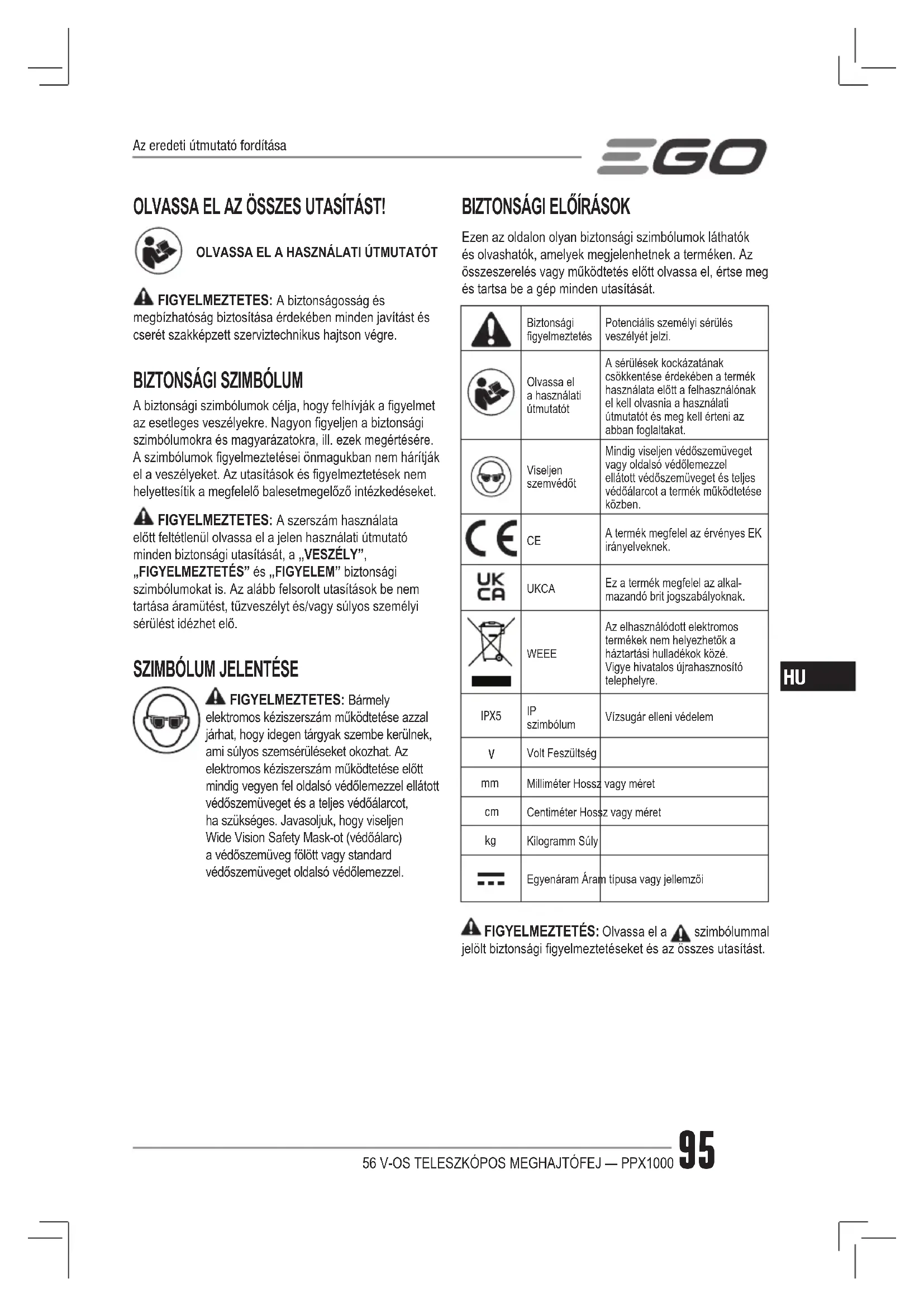 Ezen az oldalon olyan biztonsági szimbólumok láthatók és olvashatók, amelyek megjelenhetnek a terméken. Az összeszerelés vagy működtetés előtt olvassa el, értse meg és tartsa be a gép minden utasítását. Biztonsági gyelmeztetésPotenciális személyi sérülés veszélyét jelzi.Olvassa el a használati útmutatótA sérülések kockázatának csökkentése érdekében a termék használata előtt a felhasználónak el kell olvasnia a használati útmutatót és meg kell érteni az abban foglaltakat.Viseljen szemvédőtMindig viseljen védőszemüveget vagy oldalsó védőlemezzel ellátott védőszemüveget és teljes védőálarcot a termék működtetése közben. A termék megfelel az érvényes EK irányelveknek. UKCA Ez a termék megfelel az alkal-mazandó brit jogszabályoknak. WEEE Az elhasználódott elektromos termékek nem helyezhetők a háztartási hulladékok közé. Vigye hivatalos újrahasznosító telephelyre. IPX5 IP szimbólumVízsugár elleni védelem Volt Feszültség Milliméter Hossz vagy méret Centiméter Hossz vagy méret Kilogramm SúlyEgyenáram Áram típusa vagy jellemzői FIGYELMEZTETÉS: Olvassa el a szimbólummal jelölt biztonsági gyelmeztetéseket és az összes utasítást. Az eredeti útmutató fordítása56 V-OS TELESZKÓPOS MEGHAJTÓFEJ — PPX100096