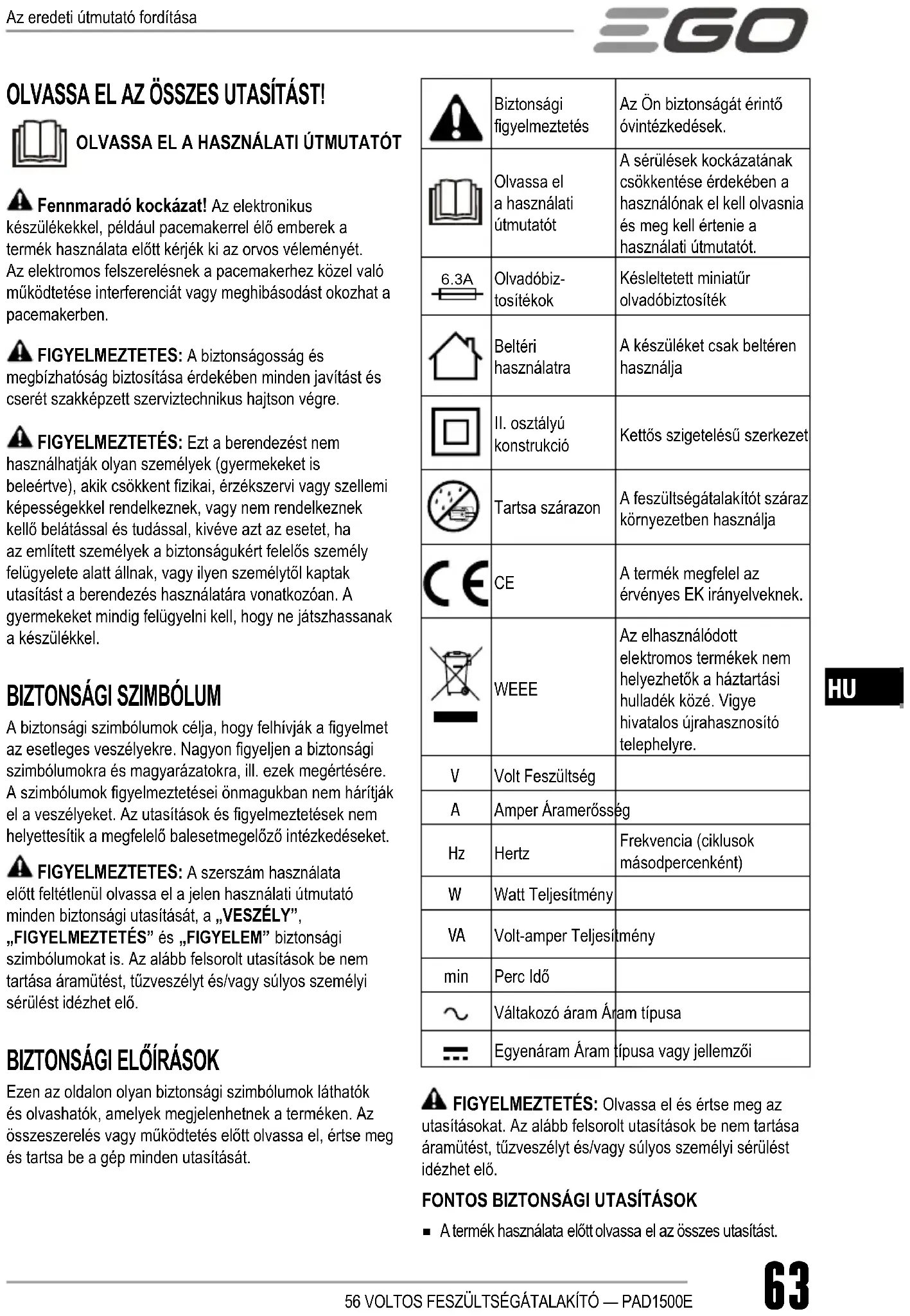 ◾ A termék használata előtt olvassa el az összes utasítást. Az eredeti útmutató fordítása56 VOLTOS FESZÜLTSÉGÁTALAKÍTÓ — PAD1500E64