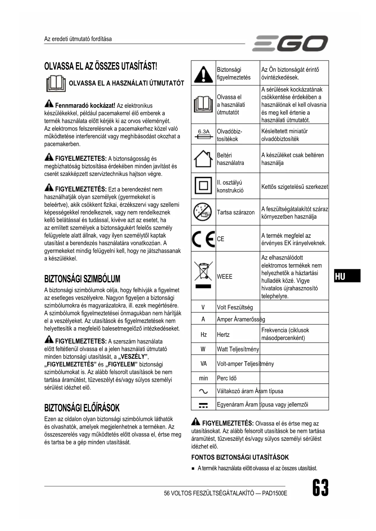 HASZNÁLATI ÚTMUTATÓ PAD1500E EGO