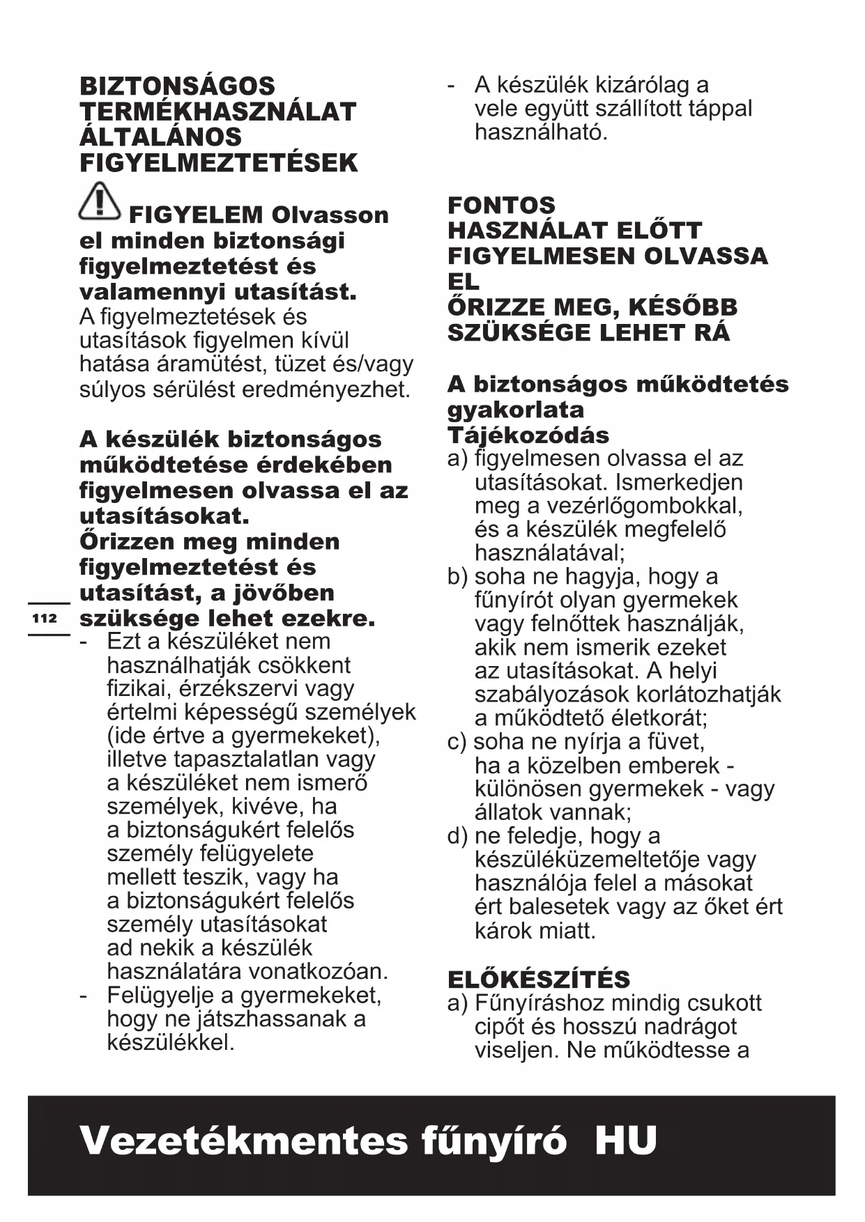 a) Fűnyíráshoz mindig csukott cipőt és hosszú nadrágot viseljen. Ne működtesse a113 Vezetékmentes fűnyíró HU készüléket mezítláb vagy nyitott szandálban; b) alaposan ellenőrizze a területet, ahol a készüléket használni fogja, és távolítson el minden tárgyat, amit a fűnyíró eldobhatna; c) Használat előtt mindig nézze meg alaposan, hogy a kések, csavarok és a vágószerkezet nem kopottak vagy sérültek-e. A kopott vagy sérült késeket és csavarokat az egyensúly megőrzése végett mindig párban cserélje. A sérült és olvashatatlan címkéket cserélje ki.