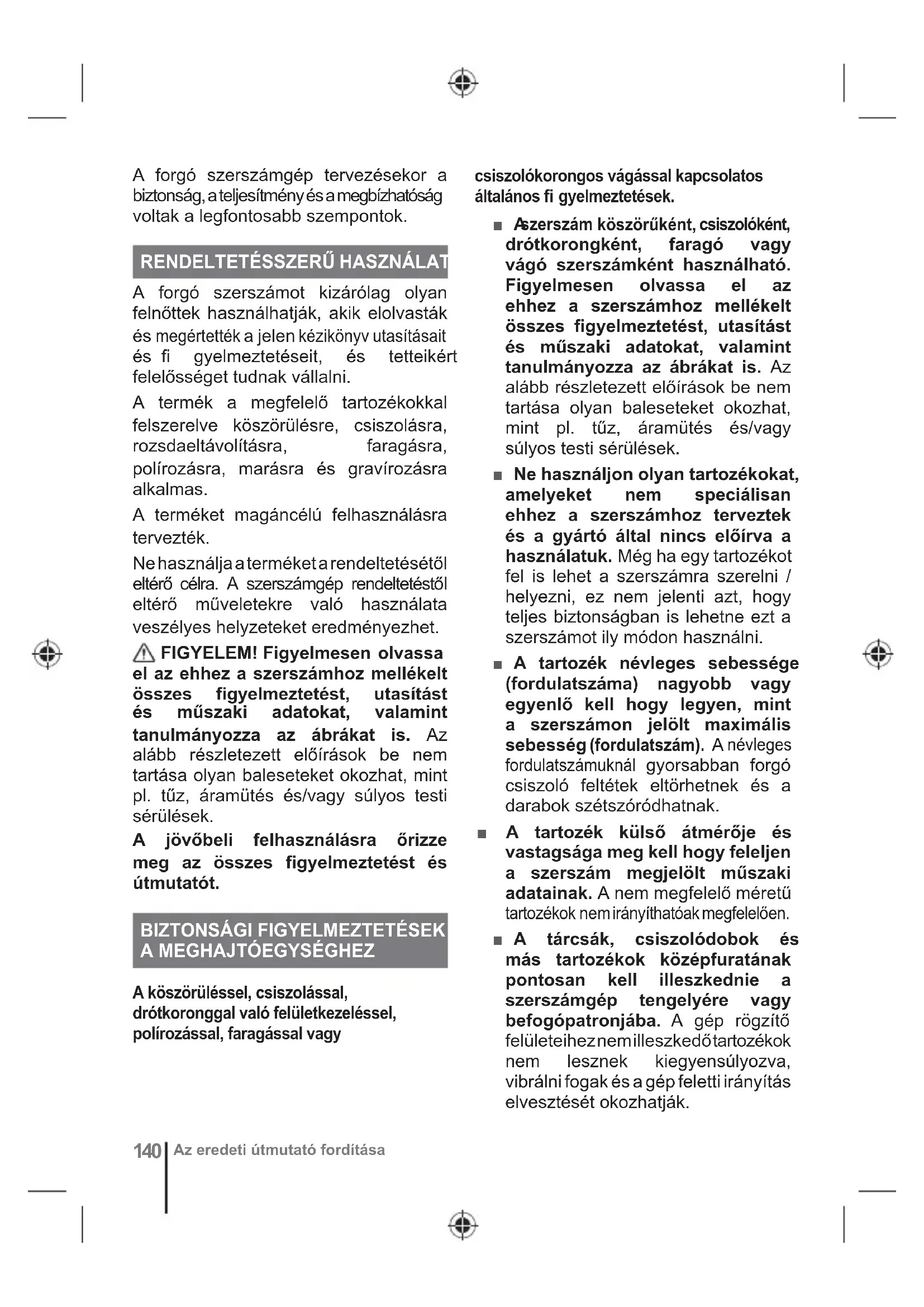 Az eredeti útmutató fordítása■ A tüskés illesztésű korongokat, csiszolódobokat, vágótárcsákat és más tartozékokat teljesen be kell illeszteni a befogópatronba vagy a tokmányba. Ha a tüske nincs eléggé behelyezve és/vagy a tárcsa túllógása túl hosszú, a rögzített tárcsa kilazulhat és nagy fordulatszámon kieshet. ■ Ne használjon sérült tartozékot. Minden használat előtt vizsgálja át a tartozékokat, például a csiszolókorongokat szilánkok és repedések, a csiszolódobokat repedések, szakadás vagy túlzott kopás, a drótkefét pedig kilazult vagy törött drótok tekintetében. Amennyiben a szerszám vagy a tartozék leesett, ellenőrizze hogy semelyik alkatelem nem sérült, szükség esetén pedig szereljen / tegyen fel egy sérülésmentes tartozékot. Miután leellenőrizte, hogy a tartozék jó állapotban van, és felszerelte / felhelyezte azt, akkor helyezkedjen el biztonságos távolságban a mozgó tartozéktól és hagyja hogy a szerszám egy percig maximális fordulatszámon működjön. Ha a tartozék sérült, akkor el fog törni e teszt során. ■ Viseljen személyi védőfelszerelést. Aszerint, hogy mire használja a szerszámot, viseljen védőmaszkot, biztonsági- vagy védőszemüveget. A körülményeknek megfelelően viseljen pormaszkot, fülvédőt, kesztyűt és az apró csiszolószemcséktől vagy a munkadarabból származó részecskéktől védő kötényt. A védőszemüveg lehetővé teszi, hogy a kipattogó törmelék ne sértse meg a szemet. A porvédő maszk lehetővé teszi a munkafolyamat által keltett részecskék kiszűrését. Halláskárosodást okozhat, ha erős zajnak hosszabb időn keresztüli ki van téve. ■ A munkát szemlélőket tartsa megfelelő távolságban