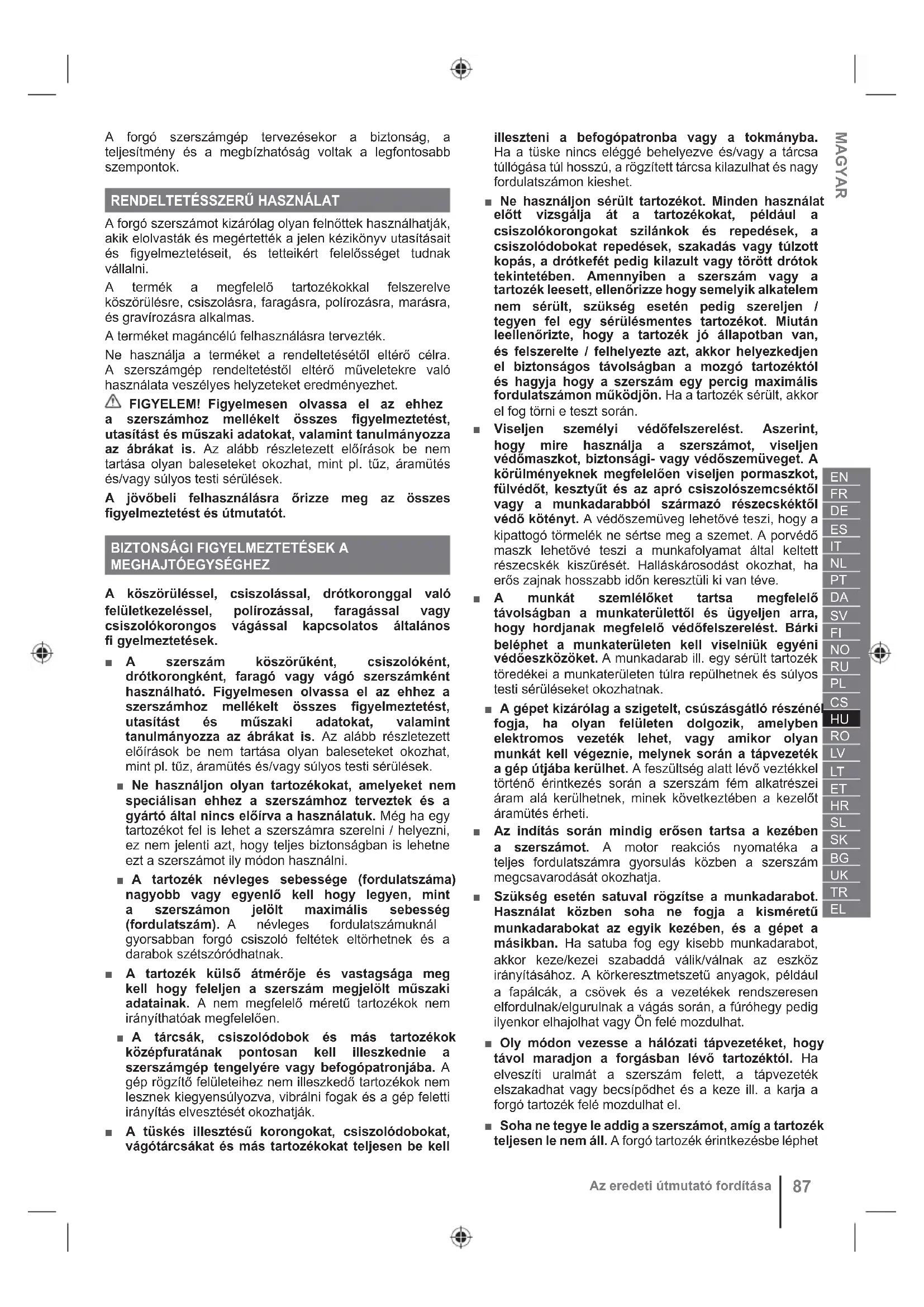 A köszörüléssel, csiszolással, drótkoronggal való felületkezeléssel, polírozással, faragással vagy csiszolókorongos vágással kapcsolatos általános fi gyelmeztetések. ■ A szerszám köszörűként, csiszolóként, drótkorongként, faragó vagy vágó szerszámként használható. Figyelmesen olvassa el az ehhez a szerszámhoz mellékelt összes figyelmeztetést, utasítást és műszaki adatokat, valamint tanulmányozza az ábrákat is. Az alább részletezett előírások be nem tartása olyan baleseteket okozhat, mint pl. tűz, áramütés és/vagy súlyos testi sérülések. ■ Ne használjon olyan tartozékokat, amelyeket nem speciálisan ehhez a szerszámhoz terveztek és a gyártó által nincs előírva a használatuk. Még ha egy tartozékot fel is lehet a szerszámra szerelni / helyezni, ez nem jelenti azt, hogy teljes biztonságban is lehetne ezt a szerszámot ily módon használni. ■ A tartozék névleges sebessége (fordulatszáma) nagyobb vagy egyenlő kell hogy legyen, mint a szerszámon jelölt maximális sebesség (fordulatszám). A névleges fordulatszámuknál gyorsabban forgó csiszoló feltétek eltörhetnek és a darabok szétszóródhatnak. ■ A tartozék külső átmérője és vastagsága meg kell hogy feleljen a szerszám megjelölt műszaki adatainak. A nem megfelelő méretű tartozékok nem irányíthatóak megfelelően. ■ A tárcsák, csiszolódobok és más tartozékok középfuratának pontosan kell illeszkednie a szerszámgép tengelyére vagy befogópatronjába. A gép rögzítő felületeihez nem illeszkedő tartozékok nem lesznek kiegyensúlyozva, vibrálni fogak és a gép feletti irányítás elvesztését okozhatják. ■ A tüskés illesztésű korongokat, csiszolódobokat, vágótárcsákat és más tartozékokat teljesen be kell illeszteni a befogópatronba vagy a tokmányba. Ha a tüske nincs eléggé behelyezve és/vagy a tárcsa túllógása túl hosszú, a rögzített tárcsa kilazulhat és nagy fordulatszámon kieshet. ■ Ne használjon sérült tartozékot. Minden használat előtt vizsgálja át a tartozékokat, például a csiszolókorongokat szilánkok és repedések, a csiszolódobokat repedések, szakadás vagy túlzott kopás, a drótkefét pedig kilazult vagy törött drótok tekintetében. Amennyiben a szerszám vagy a tartozék leesett, ellenőrizze hogy semelyik alkatelem nem sérült, szükség esetén pedig szereljen / tegyen fel egy sérülésmentes tartozékot. Miután leellenőrizte, hogy a tartozék jó állapotban van, és felszerelte / felhelyezte azt, akkor helyezkedjen el biztonságos távolságban a mozgó tartozéktól és hagyja hogy a szerszám egy percig maximális fordulatszámon működjön. Ha a tartozék sérült, akkor el fog törni e teszt során. ■ Viseljen személyi védőfelszerelést. Aszerint, hogy mire használja a szerszámot, viseljen védőmaszkot, biztonsági- vagy védőszemüveget. A körülményeknek megfelelően viseljen pormaszkot, fülvédőt, kesztyűt és az apró csiszolószemcséktől vagy a munkadarabból származó részecskéktől védő kötényt. A védőszemüveg lehetővé teszi, hogy a kipattogó törmelék ne sértse meg a szemet. A porvédő maszk lehetővé teszi a munkafolyamat által keltett részecskék kiszűrését. Halláskárosodást okozhat, ha erős zajnak hosszabb időn keresztüli ki van téve. ■ A munkát szemlélőket tartsa megfelelő távolságban a munkaterülettől és ügyeljen arra, hogy hordjanak megfelelő védőfelszerelést. Bárki beléphet a munkaterületen kell viselniük egyéni védőeszközöket. A munkadarab ill. egy sérült tartozék töredékei a munkaterületen túlra repülhetnek és súlyos testi sérüléseket okozhatnak. ■ A gépet kizárólag a szigetelt, csúszásgátló részénél fogja, ha olyan felületen dolgozik, amelyben elektromos vezeték lehet, vagy amikor olyan munkát kell végeznie, melynek során a tápvezeték a gép útjába kerülhet. A feszültség alatt lévő veztékkel történő érintkezés során a szerszám fém alkatrészei áram alá kerülhetnek, minek következtében a kezelőt áramütés érheti. ■ Az indítás során mindig erősen tartsa a kezében a szerszámot. A motor reakciós nyomatéka a teljes fordulatszámra gyorsulás közben a szerszám megcsavarodását okozhatja. ■ Szükség esetén satuval rögzítse a munkadarabot. Használat közben soha ne fogja a kisméretű munkadarabokat az egyik kezében, és a gépet a másikban. Ha satuba fog egy kisebb munkadarabot, akkor keze/kezei szabaddá válik/válnak az eszköz irányításához. A körkeresztmetszetű anyagok, például a fapálcák, a csövek és a vezetékek rendszeresen elfordulnak/elgurulnak a vágás során, a fúróhegy pedig ilyenkor elhajolhat vagy Ön felé mozdulhat. ■ Oly módon vezesse a hálózati tápvezetéket, hogy távol maradjon a forgásban lévő tartozéktól. Ha elveszíti uralmát a szerszám felett, a tápvezeték elszakadhat vagy becsípődhet és a keze ill. a karja a forgó tartozék felé mozdulhat el. ■ Soha ne tegye le addig a szerszámot, amíg a tartozék teljesen le nem áll. A forgó tartozék érintkezésbe léphet MAGYAR
