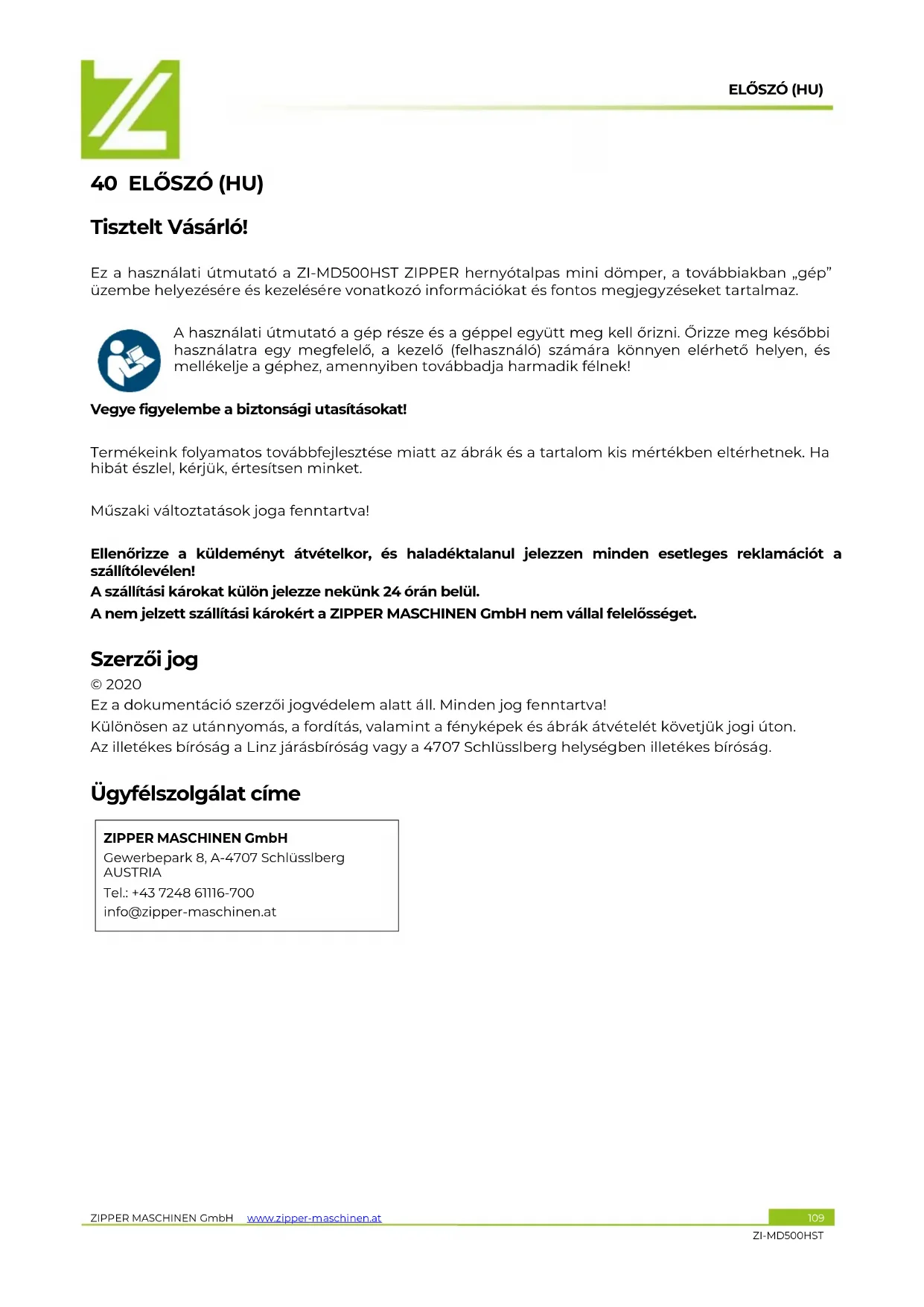 Prebacite ručicu menjača u pravilan položaj NAPOMENA Ako se ne osećate sposobnima pravilno izvršiti potrebne popravke ili ako nemate potrebnu obuku, uvek se obratite specijalizovanoj radionici kako biste rešili problem.ELŐSZÓ (HU) ZIPPER MASCHINEN GmbH www.zipper-maschinen.at 109 ZI-MD500HST 40 ELŐSZÓ (HU) Tisztelt Vásárló! Ez a használati útmutató a ZI-MD500HST ZIPPER hernyótalpas mini dömper, a továbbiakban „gép” üzembe helyezésére és kezelésére vonatkozó információkat és fontos megjegyzéseket tartalmaz. A használati útmutató a gép része és a géppel együtt meg kell őrizni. Őrizze meg későbbi használatra egy megfelelő, a kezelő (felhasználó) számára könnyen elérhető helyen, és mellékelje a géphez, amennyiben továbbadja harmadik félnek! Vegye figyelembe a biztonsági utasításokat! Termékeink folyamatos továbbfejlesztése miatt az ábrák és a tartalom kis mértékben eltérhetnek. Ha hibát észlel, kérjük, értesítsen minket. Műszaki változtatások joga fenntartva! Ellenőrizze a küldeményt átvételkor, és haladéktalanul jelezzen minden esetleges reklamációt a szállítólevélen! A szállítási károkat külön jelezze nekünk 24 órán belül. A nem jelzett szállítási károkért a ZIPPER MASCHINEN GmbH nem vállal felelősséget. Szerzői jog © 2020 Ez a dokumentáció szerzői jogvédelem alatt áll. Minden jog fenntartva! Különösen az utánnyomás, a fordítás, valamint a fényképek és ábrák átvételét követjük jogi úton. Az illetékes bíróság a Linz járásbíróság vagy a 4707 Schlüsslberg helységben illetékes bíróság. Ügyfélszolgálat címe