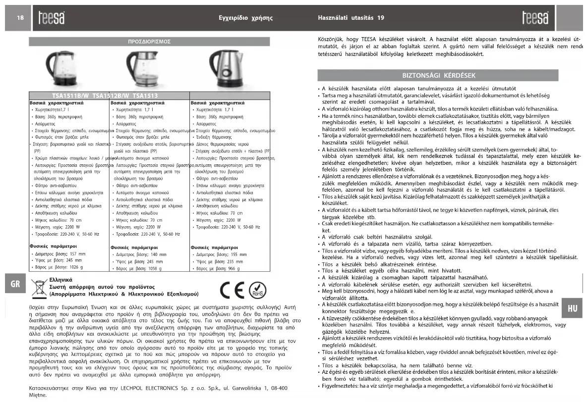 - Űrtartalom: 1,7 l• Talpazat: forgatható 360°• Kábel nélküli• Fűtőelem: lapos, beépített• Forralás jelző• Vízhőmérséklet kijelző• Borítás: szálcsiszolt alumínium +műanyag• Tulajdonságok: Víz nélküli bekapcsolásivédelem, vízforralást követő automatikuskikapcsolás• Mész szűrő• Fedél: kézzel nyitható• Csúszásmentes gumi lábak• Vízszintjelző skálával• Hely a kábel tárolására• Kábelhossz: 72 cm• Maximális teljesítmény: 2200 W• Tápellátás: 220-240 V, 50/60 HzFizikai paraméterek• Talpazat átmérő: 155 mm• Magasság talpazattal: 235 mm• Súly talpazattal: 966 g Maygar Megfelelő hulladék kezelés (használt elektromos és elektronikus eszközök) A terméken vagy a kapcsolódó szövegekben található jelölés azt jelzi, hogy élettartama végén nem szabad más háztartási hulladékkal együtt megsemmisíteni. Az ellenőrizetlen hulladékkezelés következtében a környezet és az emberi egészség károsodásának elkerülése érdekében kérjük, különítse el a terméket más hulladékfajtáktól, a felelősségteljes újrahasznosítás, az anyagi erőforrások újra felhasználásának, mint állandó gyakorlatnak az elősegítése érdekében. A háztartási felhasználók a termék környezetre nem káros újra hasznosításának érdekében vegyék fel a kapcsolatot a kiskereskedői hálózattal, ahol vették a terméket, vagy a helyi hatóságokkal, hogy információt szerezzenek, hogy hol és milyen módon semmisíthetik meg a terméket. Az üzleti felhasználóknak kapcsolatba kell lépniük be‐ szállítójukkal, és ellenőrizniük kell a vételi szerződés feltételeit. A terméket nem szabad más kommun‐ ális hulladékkal együtt megsemmisíteni. Gyártotta CHRL a LECHPOL ELECTRONICS Sp. z o.o. számára Sp.k., Garwolińska utca 1, 08-400 Miętne.EERSTE GEBRUIK VAN DE WATERKOKER Bedankt voor de aankoop van dit apparaat van TEESA. Lees voorafgaand aan gebruik van het apparaat aandachtig de gebruiksaanwijzing en volg de aanwijzingen erin op. De fabrikant stelt zich niet aansprakelijk voor schade ten gevolg van apparaatgebruik in strijd met het beoogde doeleinde of door onjuiste bediening. VEILIGHEIDSKWESTIES