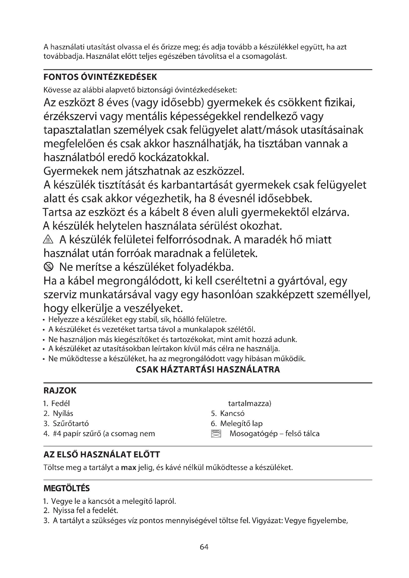 Kövesse az alábbi alapvető biztonsági óvintézkedéseket: Az eszközt 8 éves (vagy idősebb) gyermekek és csökkent zikai, érzékszervi vagy mentális képességekkel rendelkező vagy tapasztalatlan személyek csak felügyelet alatt/mások utasításainak megfelelően és csak akkor használhatják, ha tisztában vannak a használatból eredő kockázatokkal. Gyermekek nem játszhatnak az eszközzel. A készülék tisztítását és karbantartását gyermekek csak felügyelet alatt és csak akkor végezhetik, ha 8 évesnél idősebbek. Tartsa az eszközt és a kábelt 8 éven aluli gyermekektől elzárva. A készülék helytelen használata sérülést okozhat. h A készülék felületei felforrósodnak. A maradék hő miatt használat után forróak maradnak a felületek. l Ne merítse a készüléket folyadékba. Ha a kábel megrongálódott, ki kell cseréltetni a gyártóval, egy szerviz munkatársával vagy egy hasonlóan szakképzett személlyel, hogy elkerülje a veszélyeket.