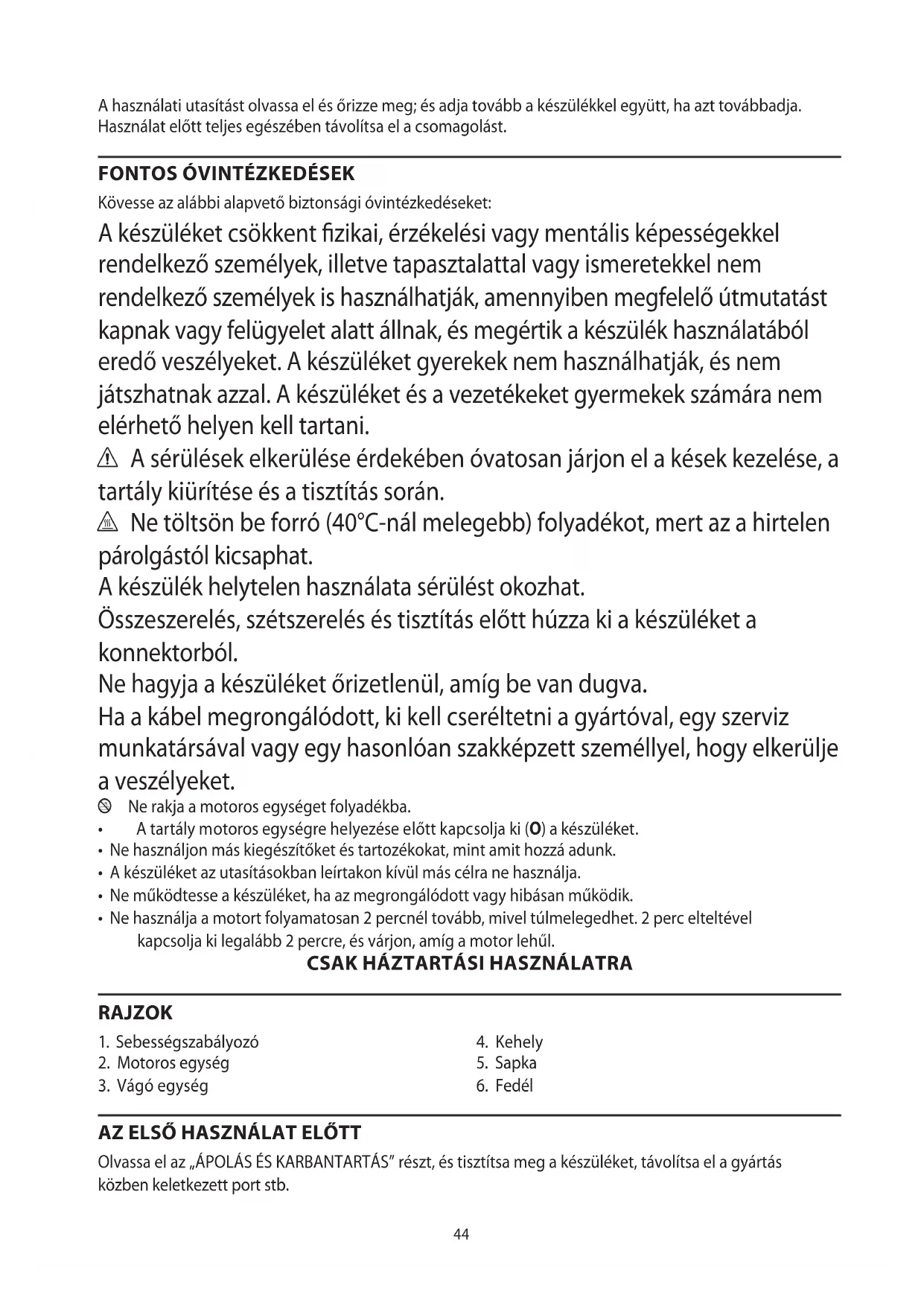 Kövesse az alábbi alapvető biztonsági óvintézkedéseket: A készüléket csökkent zikai, érzékelési vagy mentális képességekkel rendelkező személyek, illetve tapasztalattal vagy ismeretekkel nem rendelkező személyek is használhatják, amennyiben megfelelő útmutatást kapnak vagy felügyelet alatt állnak, és megértik a készülék használatából eredő veszélyeket. A készüléket gyerekek nem használhatják, és nem játszhatnak azzal. A készüléket és a vezetékeket gyermekek számára nem elérhető helyen kell tartani. c A sérülések elkerülése érdekében óvatosan járjon el a kések kezelése, a tartály kiürítése és a tisztítás során. h Ne töltsön be forró (40°C-nál melegebb) folyadékot, mert az a hirtelen párolgástól kicsaphat. A készülék helytelen használata sérülést okozhat. Összeszerelés, szétszerelés és tisztítás előtt húzza ki a készüléket a konnektorból. Ne hagyja a készüléket őrizetlenül, amíg be van dugva. Ha a kábel megrongálódott, ki kell cseréltetni a gyártóval, egy szerviz munkatársával vagy egy hasonlóan szakképzett személlyel, hogy elkerülje a veszélyeket. l Ne rakja a motoros egységet folyadékba.
