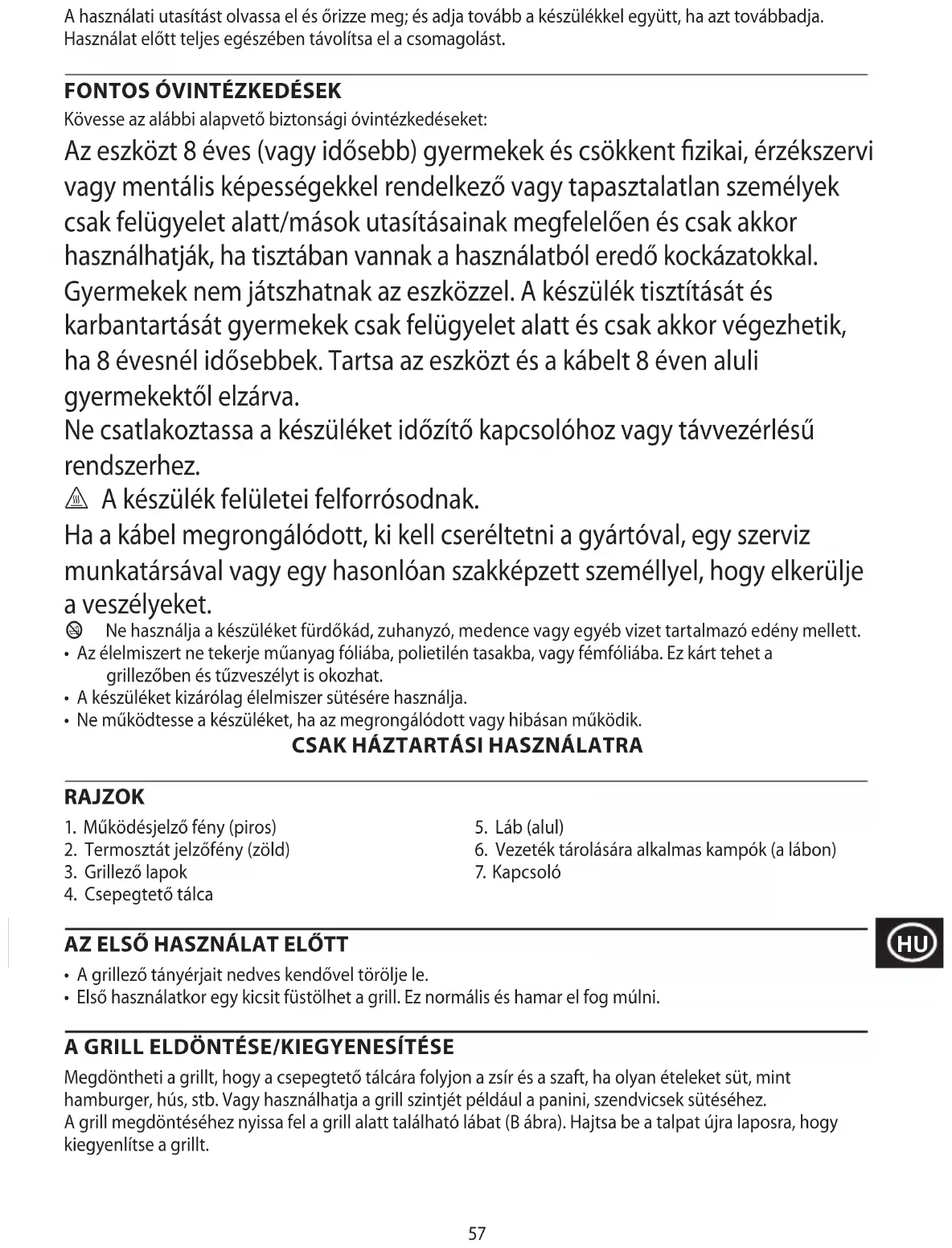 - Első használatkor egy kicsit füstölhet a grill. Ez normális és hamar el fog múlni. A GRILL ELDÖNTÉSE/KIEGYENESÍTÉSE Megdöntheti a grillt, hogy a csepegtető tálcára folyjon a zsír és a szaft, ha olyan ételeket süt, mint hamburger, hús, stb. Vagy használhatja a grill szintjét például a panini, szendvicsek sütéséhez. A grill megdöntéséhez nyissa fel a grill alatt található lábat (B ábra). Hajtsa be a talpat újra laposra, hogy kiegyenlítse a grillt.