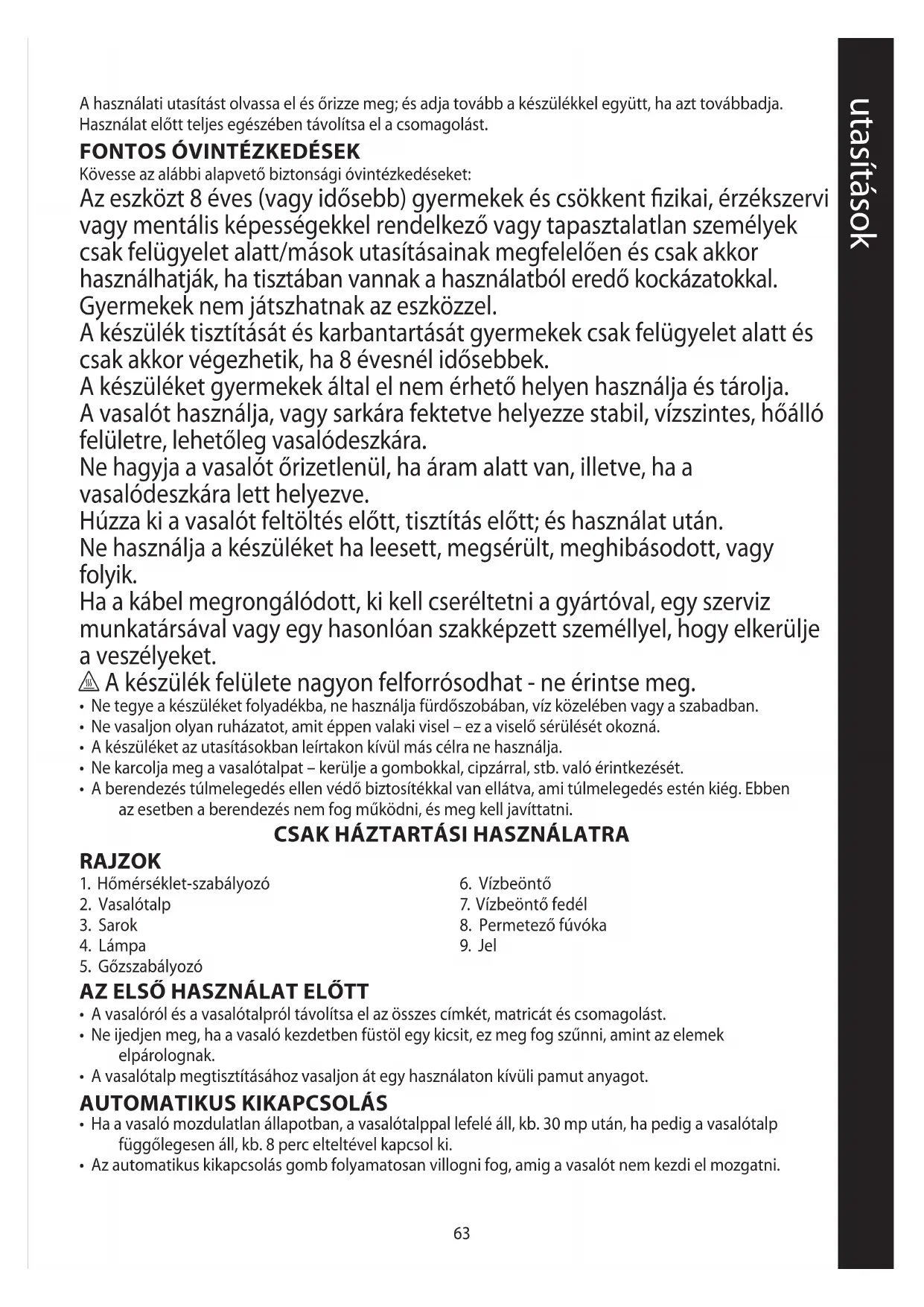 Kövesse az alábbi alapvető biztonsági óvintézkedéseket: Az eszközt 8 éves (vagy idősebb) gyermekek és csökkent fizikai, érzékszervi vagy mentális képességekkel rendelkező vagy tapasztalatlan személyek csak felügyelet alatt/mások utasításainak megfelelően és csak akkor használhatják, ha tisztában vannak a használatból eredő kockázatokkal. Gyermekek nem játszhatnak az eszközzel. A készülék tisztítását és karbantartását gyermekek csak felügyelet alatt és csak akkor végezhetik, ha 8 évesnél idősebbek. A készüléket gyermekek által el nem érhető helyen használja és tárolja. A vasalót használja, vagy sarkára fektetve helyezze stabil, vízszintes, hőálló felületre, lehetőleg vasalódeszkára. Ne hagyja a vasalót őrizetlenül, ha áram alatt van, illetve, ha a vasalódeszkára lett helyezve. Húzza ki a vasalót feltöltés előtt, tisztítás előtt; és használat után. Ne használja a készüléket ha leesett, megsérült, meghibásodott, vagy folyik. Ha a kábel megrongálódott, ki kell cseréltetni a gyártóval, egy szerviz munkatársával vagy egy hasonlóan szakképzett személlyel, hogy elkerülje a veszélyeket. h A készülék felülete nagyon felforrósodhat - ne érintse meg.