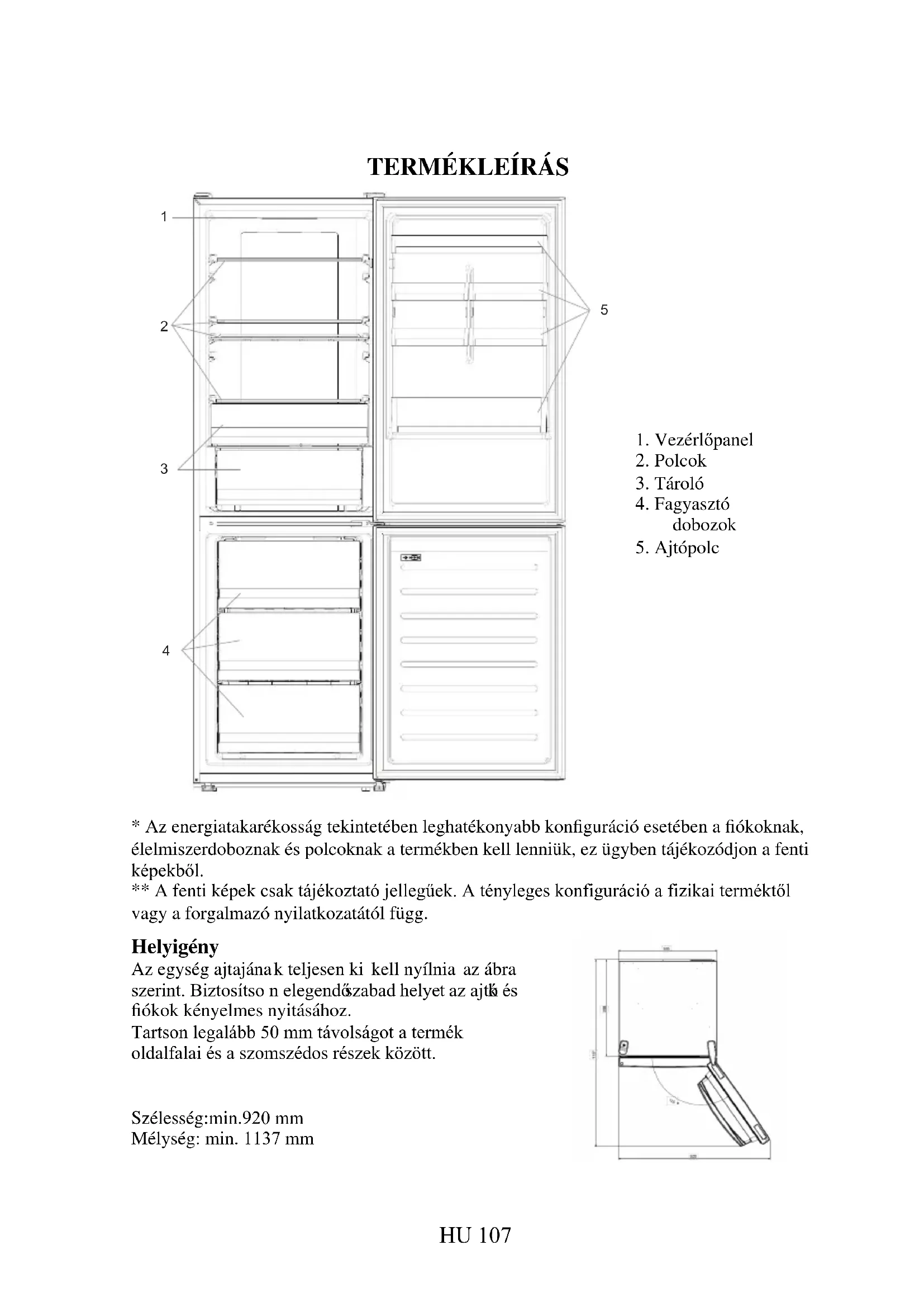 - Az energiatakarékosság tekintetében leghatékonyabb konfiguráció esetében a fiókoknak, élelmiszerdoboznak és polcoknak a termékben kell lenniük, ez ügyben tájékozódjon a fenti képekből. ** A fenti képek csak tájékoztató jellegűek. A tényleges konfiguráció a fizikai terméktől vagy a forgalmazó nyilatkozatától függ. Helyigény Az egység ajtajána k teljesen ki kell nyílnia az ábra szerint. Biztosítso n elegendő szabad helyet az ajtók és fiókok kényelmes nyitásához. Tartson legalább 50 mm távolságot a termék oldalfalai és a szomszédos részek között. Szélesség:min.920 mm Mélység: min. 1137 mm