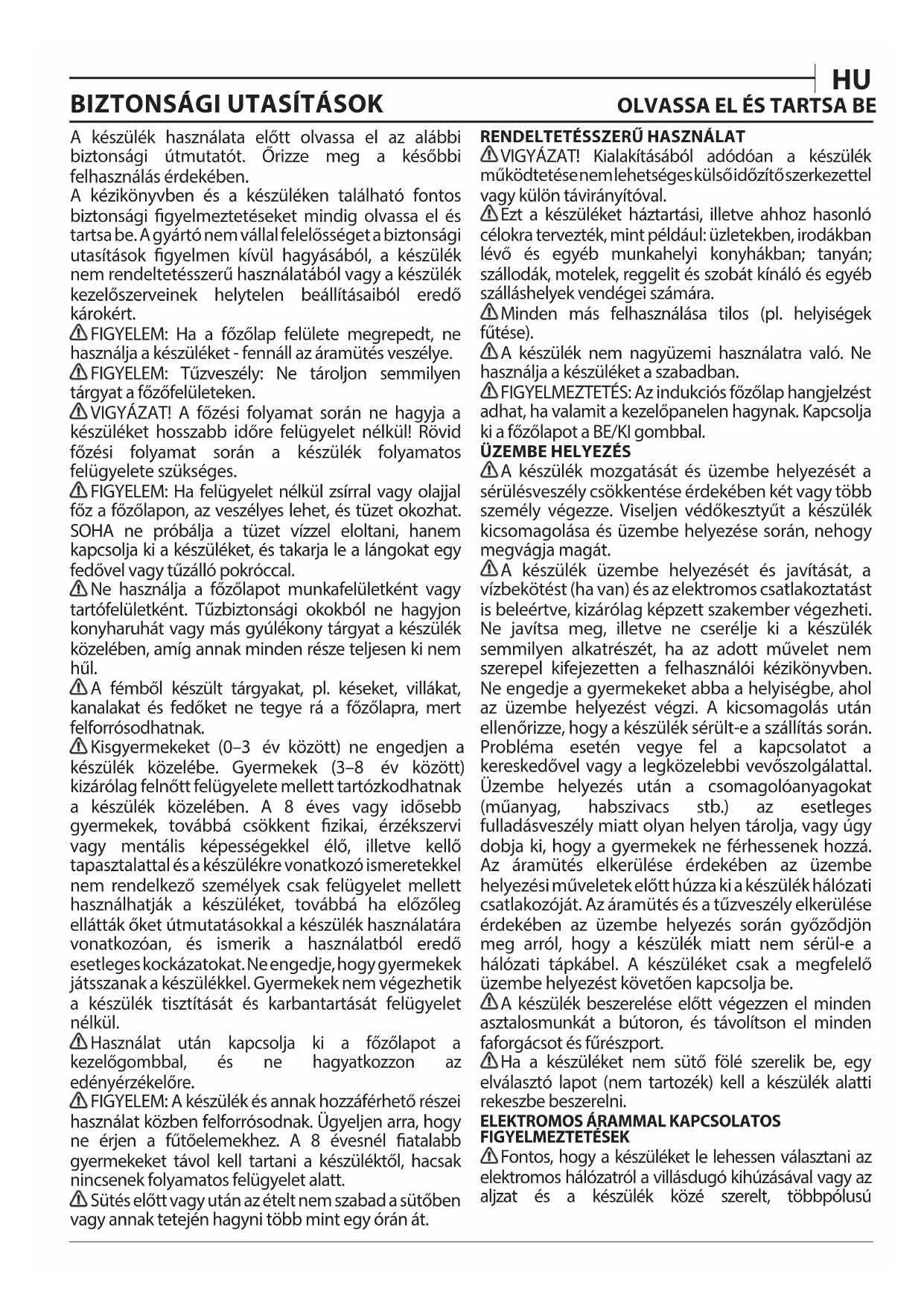 VIGYÁZAT! Kialakításából adódóan a készülék működtetése nem lehetséges külső időzítő szerkezettel vagy külön távirányítóval. Ezt a készüléket háztartási, illetve ahhoz hasonló célokra tervezték, mint például: üzletekben, irodákban lévő és egyéb munkahelyi konyhákban; tanyán; szállodák, motelek, reggelit és szobát kínáló és egyéb szálláshelyek vendégei számára. Minden más felhasználása tilos (pl. helyiségek fűtése). A készülék nem nagyüzemi használatra való. Ne használja a készüléket a szabadban. FIGYELMEZTETÉS: Az indukciós főzőlap hangjelzést adhat, ha valamit a kezelőpanelen hagynak. Kapcsolja ki a főzőlapot a BE/KI gombbal.