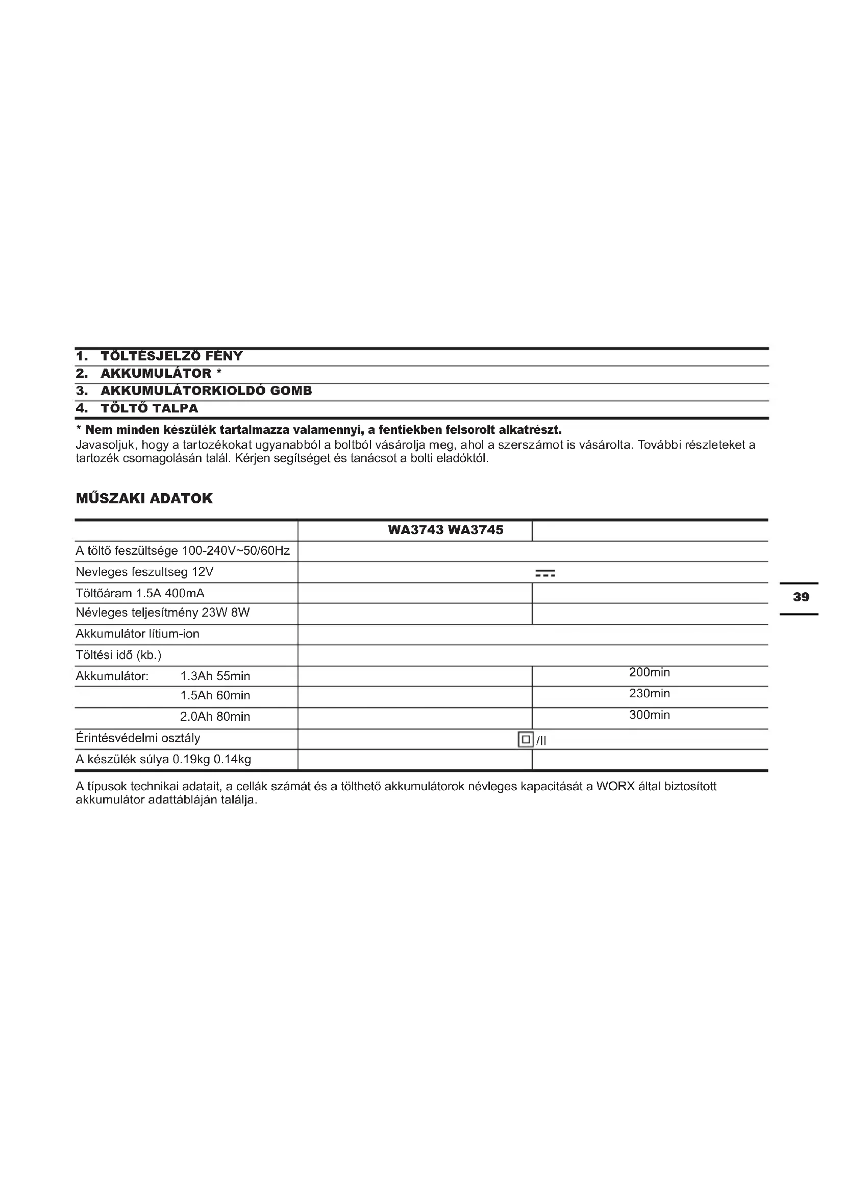 WA3743 WA3745 A töltő feszültsége 100-240V~50/60Hz Nevleges feszultseg 12V Töltőáram 1.5A 400mA Névleges teljesítmény 23W 8W Akkumulátor lítium-ion Töltési idő (kb.) Akkumulátor: 1.3Ah 55min 200min 1.5Ah 60min 230min 2.0Ah 80min 300min Érintésvédelmi osztály /II A készülék súlya 0.19kg 0.14kg A típusok technikai adatait, a cellák számát és a tölthető akkumulátorok névleges kapacitását a WORX által biztosított akkumulátor adattábláján találja.40