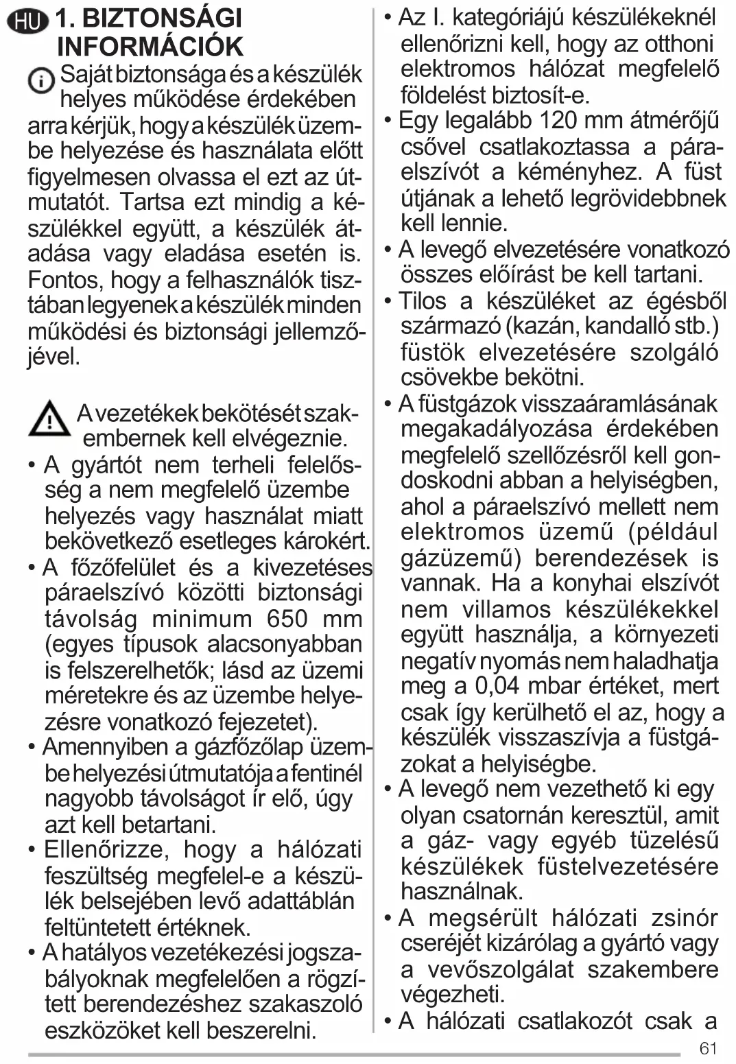 - A füstgázok visszaáramlásának megakadályozása érdekében megfelelő szellőzésről kell gon- doskodni abban a helyiségben, ahol a páraelszívó mellett nem elektromos üzemű (például gázüzemű) berendezések is vannak. Ha a konyhai elszívót nem villamos készülékekkel együtt használja, a környezeti negatív nyomás nem haladhatja meg a 0,04 mbar értéket, mert csak így kerülhető el az, hogy a készülék visszaszívja a füstgá- zokat a helyiségbe.