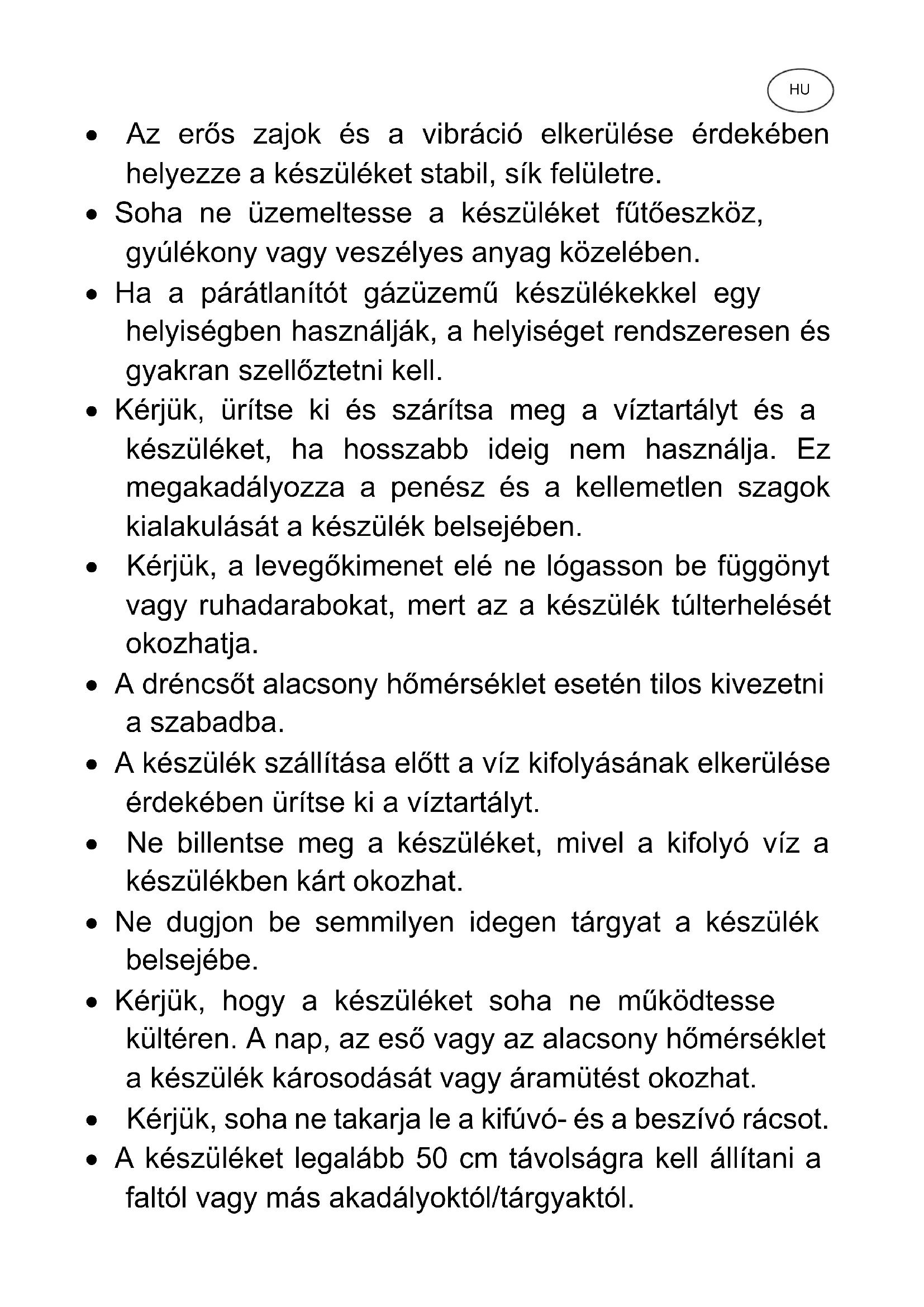 - Kérjük, ürítse ki és szárítsa meg a víztartályt és a készüléket, ha hosszabb ideig nem használja. Ez megakadályozza a penész és a kellemetlen szagok kialakulását a készülék belsejében.