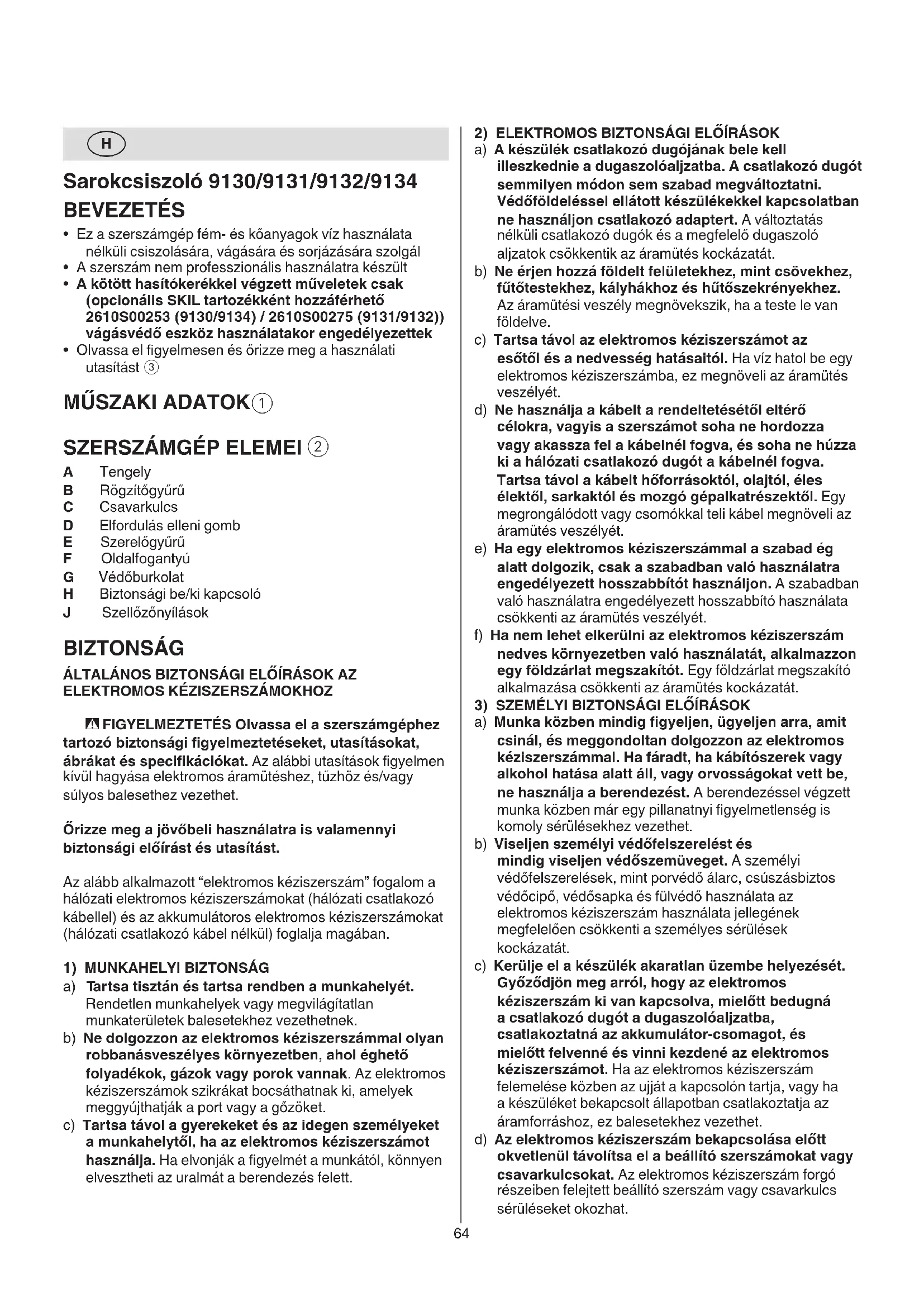 A Tengely B Rögzítőgyűrű C Csavarkulcs D Elfordulás elleni gomb E Szerelőgyűrű F Oldalfogantyú G Védőburkolat H Biztonsági be/ki kapcsoló J Szellőzőnyílások BIZTONSÁG ÁLTALÁNOS BIZTONSÁGI ELŐÍRÁSOK AZ