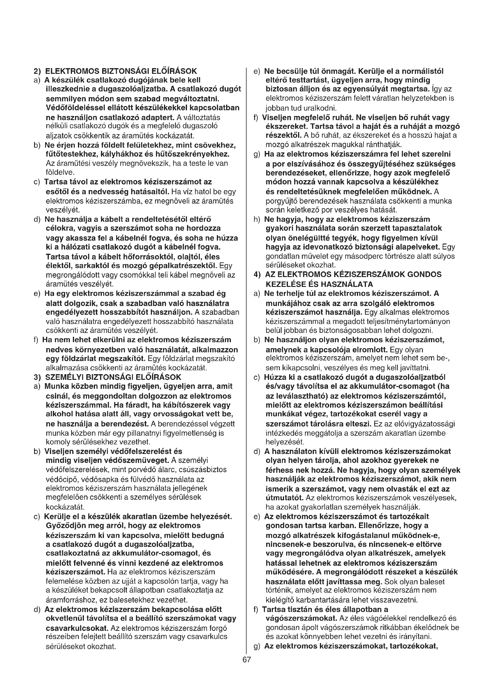 a) Ne terhelje túl az elektromos kéziszerszámot. A munkájához csak az arra szolgáló elektromos kéziszerszámot használja. Egy alkalmas elektromos kéziszerszámmal a megadott teljesítménytartományon belül jobban és biztonságosabban lehet dolgozni. b) Ne használjon olyan elektromos kéziszerszámot, amelynek a kapcsolója elromlott. Egy olyan elektromos kéziszerszám, amelyet nem lehet sem be-, sem kikapcsolni, veszélyes és meg kell javíttatni. c) Húzza ki a csatlakozó dugót a dugaszolóaljzatból és/vagy távolítsa el az akkumulátor-csomagot (ha az leválasztható) az elektromos kéziszerszámtól, mielőtt az elektromos kéziszerszámon beállítási munkákat végez, tartozékokat cserél vagy a szerszámot tárolásra elteszi. Ez az elővigyázatossági intézkedés meggátolja a szerszám akaratlan üzembe helyezését. d) A használaton kívüli elektromos kéziszerszámokat olyan helyen tárolja, ahol azokhoz gyerekek ne férhess nek hozzá. Ne hagyja, hogy olyan személyek használják az elektromos kéziszerszámot, akik nem ismerik a szerszámot, vagy nem olvasták el ezt az útmutatót. Az elektromos kéziszerszámok veszélyesek, ha azokat gyakorlatlan személyek használják. e) Az elektromos kéziszerszámot és tartozékait gondosan tartsa karban. Ellenőrizze, hogy a mozgó alkatrészek kifogástalanul működnek-e, nincsenek-e beszorulva, és nincsenek-e eltörve vagy megrongálódva olyan alkatrészek, amelyek hatással lehetnek az elektromos kéziszerszám működésére. A megrongálódott részeket a készülék használata előtt javíttassa meg. Sok olyan baleset történik, amelyet az elektromos kéziszerszám nem kielégítő karbantartására lehet visszavezetni. f) Tartsa tisztán és éles állapotban a vágószerszámokat. Az éles vágóélekkel rendelkező és gondosan ápolt vágószerszámok ritkábban ékelődnek be és azokat könnyebben lehet vezetni és irányítani. g) Az elektromos kéziszerszámokat, tartozékokat,
