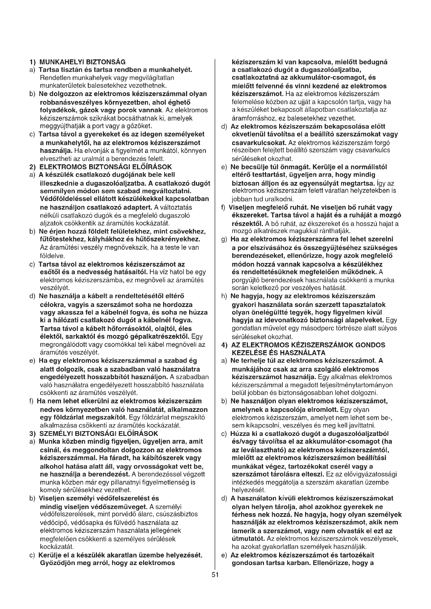 irányváltó-kapcsoló a középső (rögzített) állásban van, mielőtt beállításokat mozgó alkatrészek kifogástalanul működnek-e, nincsenek-e beszorulva, és nincsenek-e eltörve vagy megrongálódva olyan alkatrészek, amelyek hatással lehetnek az elektromos kéziszerszám működésére. A megrongálódott részeket a készülék használata előtt javíttassa meg. Sok olyan baleset történik, amelyet az elektromos kéziszerszám nem kielégítő karbantartására lehet visszavezetni. f) Tartsa tisztán és éles állapotban a vágószerszámokat. Az éles vágóélekkel rendelkező és gondosan ápolt vágószerszámok ritkábban ékelődnek be és azokat könnyebben lehet vezetni és irányítani. g) Az elektromos kéziszerszámokat, tartozékokat, betétszerszámokat stb. csak ezen előírásoknak használja. Vegye gyelembe a munkafeltételeket és a kivitelezendő munka sajátosságait. Az elektromos kéziszerszám eredeti rendeltetésétől eltérő célokra való alkalmazása veszélyes helyzetekhez vezethet. h) Tartsa szárazon, tisztán és olaj- és zsírmentes állapotban a fogantyúkat és markoló felületeket. A csúszós fogantyúk és markoló felületek váratlan helyzetekben lehetetlenné teszik az elektromos kéziszerszám biztonságos kezelését és irányítását.