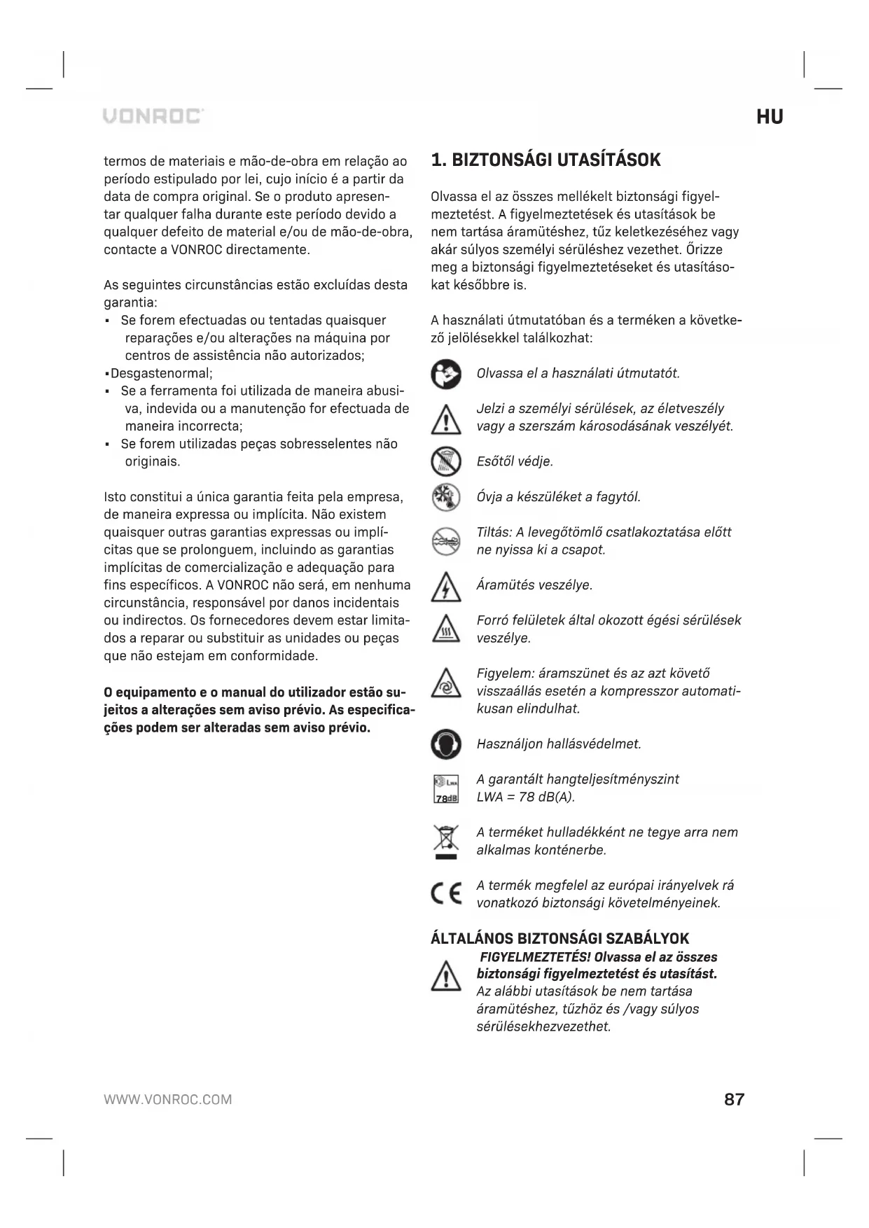 - Hogy van-e villamosenergia-ellátás (a dugasz megfelelően lett csatlakoztatva, a magneto-ter- mikus biztosítékok nem romlottak-e el). A kompresszor nem kapcsol ki Ha a kompresszor nem kapcsol ki a maximális nyomás elérésekor, a tartály biztonsági szelepe lép működésbe. A javítás érdekében vegye fel a kap- csolatot a legközelebbi hivatalos ügyfélszolgálattal. KÖRNYEZET A hibás és/vagy már feleslegessé vált elektromos, elektronikus készülékeket az ezzel foglalkozó begyűjtő helyeken kell leadni. Csak EU országokban Elektromos szerszámokat ne dobjon a háztartási hulladékba. Az elektromos és elektronikai hulladé- kokra vonatkozó, 2012/19/EU európai irányelv és annak a nemzeti törvénykezésbe történő átültetése értelmében az elhasználódott elektromos készülé- keket külön kell gyűjteni és környezetbarát módon kell kiselejtezni. GARANCIA A VONROC termékei a legmagasabb minőségi normák szerint készülnek, és az eredeti vásárlás napjától számított, törvényileg előírt időtartamig garantáljuk, hogy anyag- és gyártási hibáktól men- tesen fognak működni. Ha a terméken ezen időszak alatt bármilyen hiba jelentkezik anyag- és/vagy gyártási hiba miatt, kérjük, forduljon közvetlenül a VONROC-hoz. A garancia nem érvényes a következő körülmények egyikére sem: