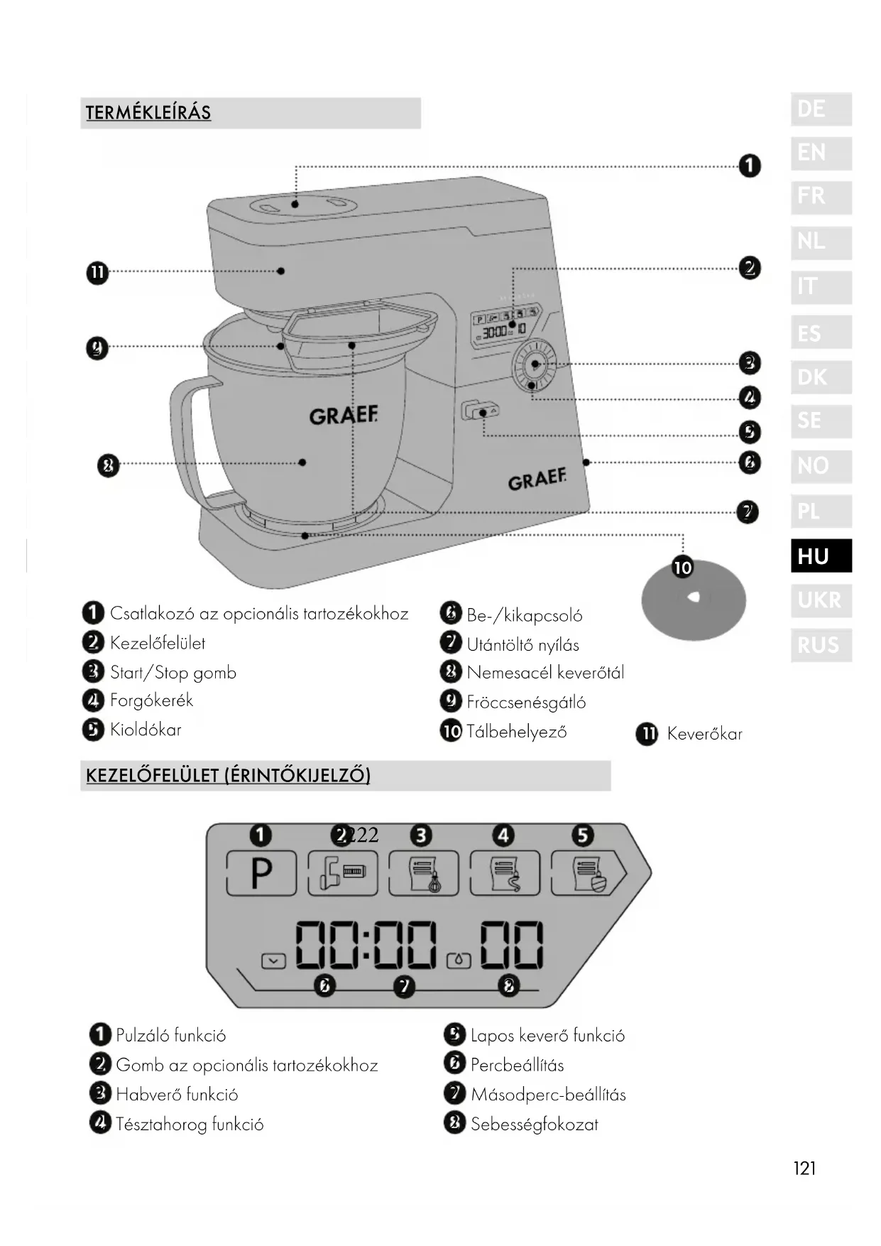 Keverőkar122 ELŐSZÓ Tisztelt Vásárlónk! Gratulálunk, hogy a konyhai robotgépünk mellett döntött. Elismert minőségi terméket vásárolt. Köszönjük a vásárlást, és kívánjuk, hogy használja sok örömmel az új konyhai robotgépét. INFORMÁCIÓK A JELEN HASZNÁLATI ÚTMUTATÓHOZ A használati útmutató a konyhai robotgéphez (a következőkben „gép”) tartozik, és fontos tud- nivalókat tartalmaz a gép üzembe helyezésével, a biztonsággal, a rendeltetésszerű használa- tával és gondozásával kapcsolatban. Tartsa a használati útmutatót mindig a gépnél. A használati útmutatót minden olyan személynek el kell olvasnia és alkalmaznia kell, aki a gép ● üzembe helyezéséért, ● kezeléséért, ● az üzemzavar elhárításáért és/vagy ● a gép tisztításért felelős. Őrizze meg ezt a használati útmutatót és adja tovább a géppel együtt a következő tulajdo- nosnak. Ez a használati útmutató nem vehet figyelembe minden elgondolható szempontot. További tudnivalók vagy problémák esetén, amelyekről ez az útmutató nem, vagy nem elég részletesen beszél, forduljon a Graef ügyfélszolgálatához, vagy a szakszervizhez.