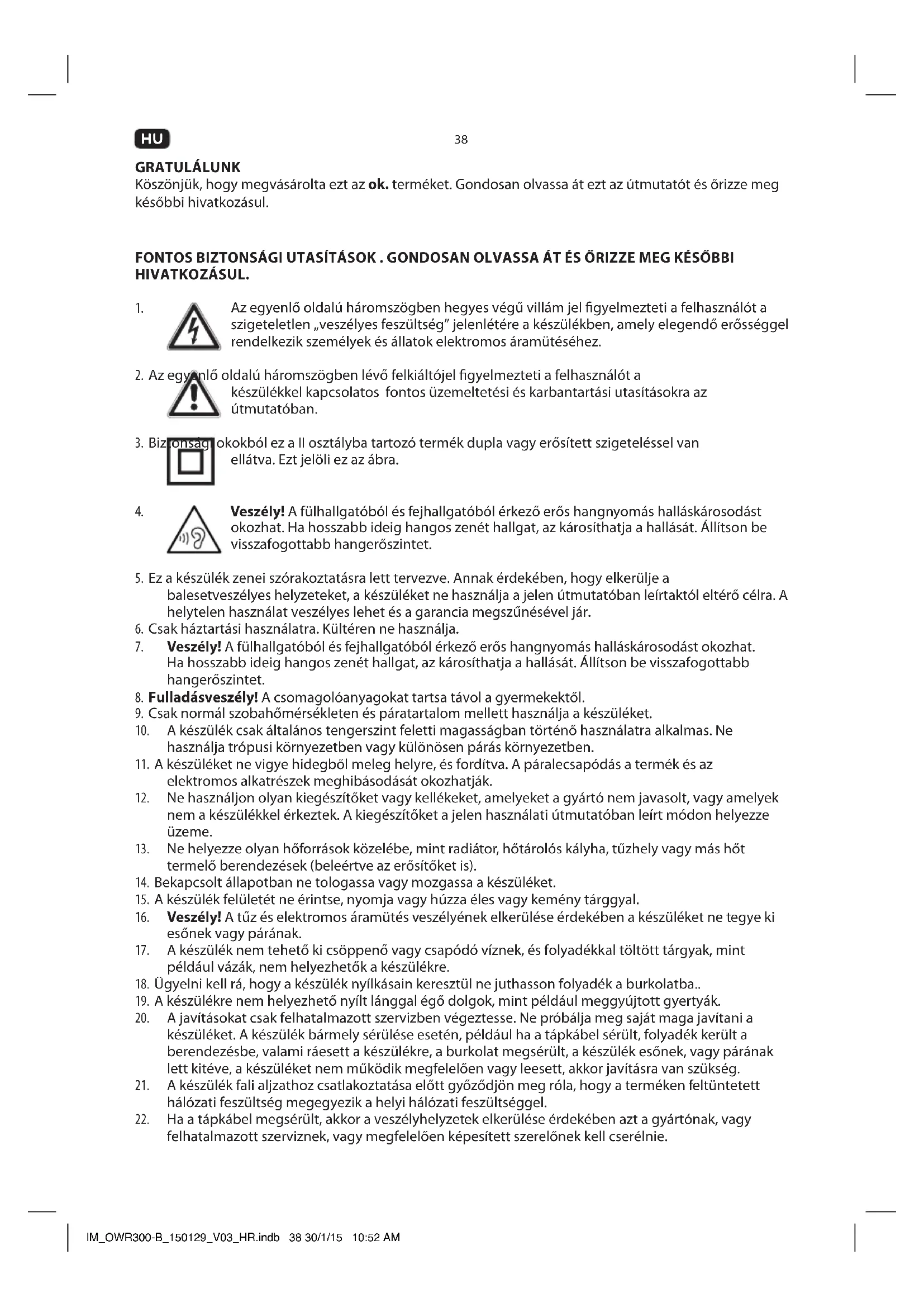 Ne dobja a készüléket ártalmatlanítás céljából a háztartási hulladékok közé. Vigye el egy, a villamos és elektronikus felszerelések újrahasznosítására kijelölt gyűjtőpontra. További információért kérjük, lépjen kapcsolatba a kiskereskedővel vagy a helyi hatóságokkal. Az elemek megsemmisítését végezze környezetbarát módon. Ne dobja az elemeket a háztartási hulladékok közé. Használja a helyi ártalmatlanító-begyűjtő rendszert, vagy kérje ki kereskedőjének tanácsát. IM_OWR300-B_150129_V03_HR.indb 44 30/1/15 10:52 AM45