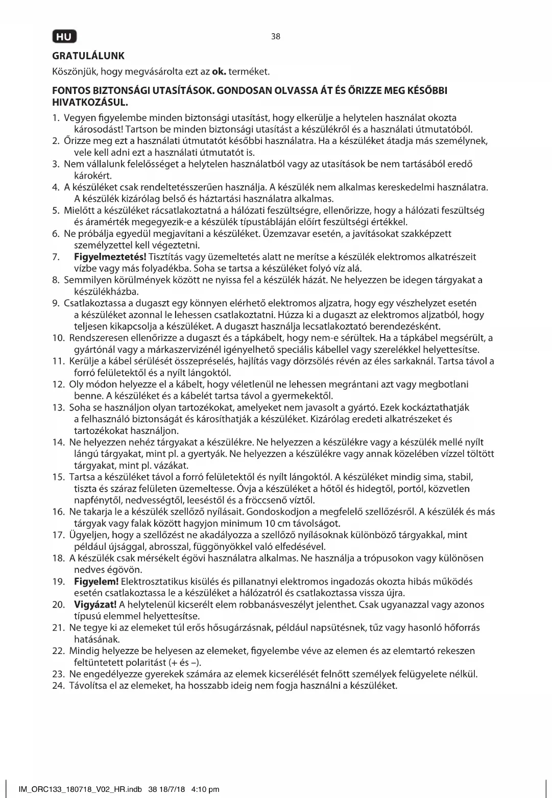 Az áthúzott szemetes tartály logó jelentése, hogy az elektromos és elektronikus felszereléseket külön helyre kell gyűjteni (WEEE). Az elektromos és elektronikus berendezések veszélyes és káros anyagokat tartalmazhatnak. Ne helyezze ezt a készüléket a helyi háztartási hulladék közé. Szállítsa a készüléket egy WEEE hulladékok újrahasznosítására kijelölt gyűjtési ponthoz. Ily módon hozzájárul az erőforrások és a környezet megőrzéséhez. Lépjen kapcsolatba a forgalmazójával vagy a helyi illetékesekkel bővebb információk érdekében. Az elemek megsemmisítését végezze környezetbarát módon. Ne dobja az elemeket a háztartási hulladékok közé. Használja a helyi ártalmatlanító-begyűjtő rendszert, vagy kérje ki kereskedőjének tanácsát. IM_ORC133_180718_V02_HR.indb 44 18/7/18 4:10 pm45