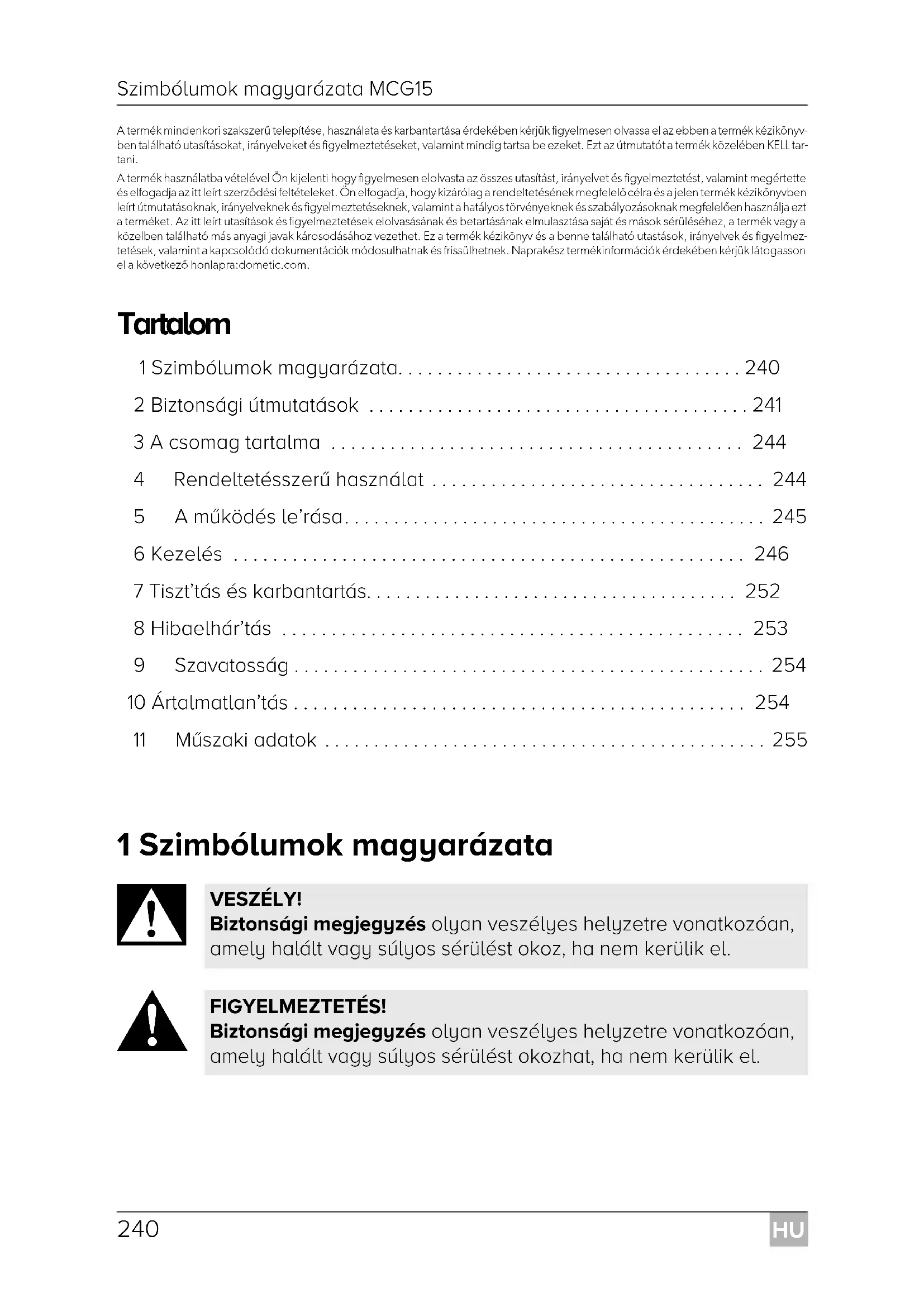 VESZÉLY! Biztonsági megjegyzés olyan veszélyes helyzetre vonatkozóan, amely halált vagy súlyos sérülést okoz, ha nem kerülik el. FIGYELMEZTETÉS! Biztonsági megjegyzés olyan veszélyes helyzetre vonatkozóan, amely halált vagy súlyos sérülést okozhat, ha nem kerülik el. MobicoolMCG15_OPM_4445103306_EMEA16_202x-xx-xx.book Seite 240 Freitag, 16. April 2021 2:17 14HU MCG15 Biztonsági útmutatások