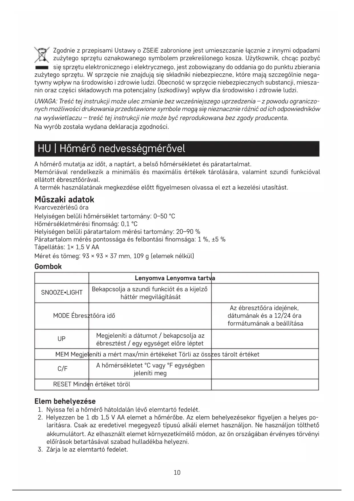 - Az elemet tilos tűzbe dobni, szétszedni, vagy rövidre zárni. Ezt a terméket nem használhatják olyan személyek (beleértve a gyermekeket is), akiket a készülék biztonságos használatában zikai, érzékszervi, vagy mentális fogyatékosság gátol, illetve akik nem rendelkeznek a használathoz kellő tapasztalattal, vagy ismerettel, kivéve azt az esetet, ha ezekre a személyekre felügyelnek, illetve az ilyen személyek biztonságáért felelős személy ki nem oktatta őket ennek a készüléknek a használatára. A gyermekek felügyelete fontos annak érdekében, hogy ne játszhassanak a készülékkel. MEGJEGZÉS: Ez a kezelési utasítás előzetes értesítés nélkül megváltozhat. A korlátozott nyomtatási lehetőségek miatt a kezelési utasításban látható szimbólumok kis mértékben eltérhetnek a kijelzőn megjelenőtől. Ezt a kezelési utasítást tilos reprodukálni a gyártó engedélye nélkül. A termék rendelkezik Megfelelőségi Tanúsítvánnyal. SI | Termometer z vlagomerom Termometer prikazuje uro, koledar, podatek o notranji temperaturi in vlažnosti. Ima pomnilnik minimalnih in maksimalnih vrednosti, budilko s funkcijo ponovnega bujenja. Preden začnete izdelek uporabljati, pozorno preberite navodila za uporabo. Tehnična specikacija Ura vodena s kvarc kristalom Območje notranje temperature: 0–50 °C Ločljivost temperature 0,1°C Območje notranje vlažnosti: 20–90 % Ločljivost in natančnost merjenja vlažnosti: 1 %, ±5 % Napajanje: 1×1,5 V AA Dimenzije in masa: 93×93×37 mm, 109 g (brez baterij) Pregled tipk Pritisk tipke Pridržanje tipke SNOOZE•LIGHT aktivacija Snooze budilke/osvetlitev zaslona MODE čas budilke nastavitev budilke, ure, datuma, 12/24 h