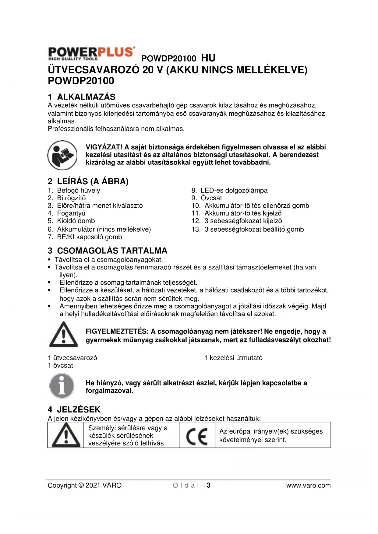Az európai irányelv(ek) szükséges követelményei szerint.POWDP20100 HU Copyright © 2021 VARO O l d a l | 4 www.varo.com