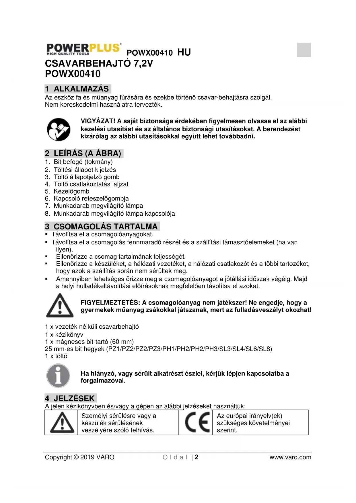 Copyright © 2019 VARO O l d a l | 2 www.varo.com CSAVARBEHAJTÓ 7,2V POWX00410 1 ALKALMAZÁS Az eszköz fa és műanyag fúrására és ezekbe történő csavar-behajtásra szolgál. Nem kereskedelmi használatra tervezték. VIGYÁZAT! A saját biztonsága érdekében figyelmesen olvassa el az alábbi kezelési utasítást és az általános biztonsági utasításokat. A berendezést kizárólag az alábbi utasításokkal együtt lehet továbbadni. 2 LEÍRÁS (A ÁBRA)