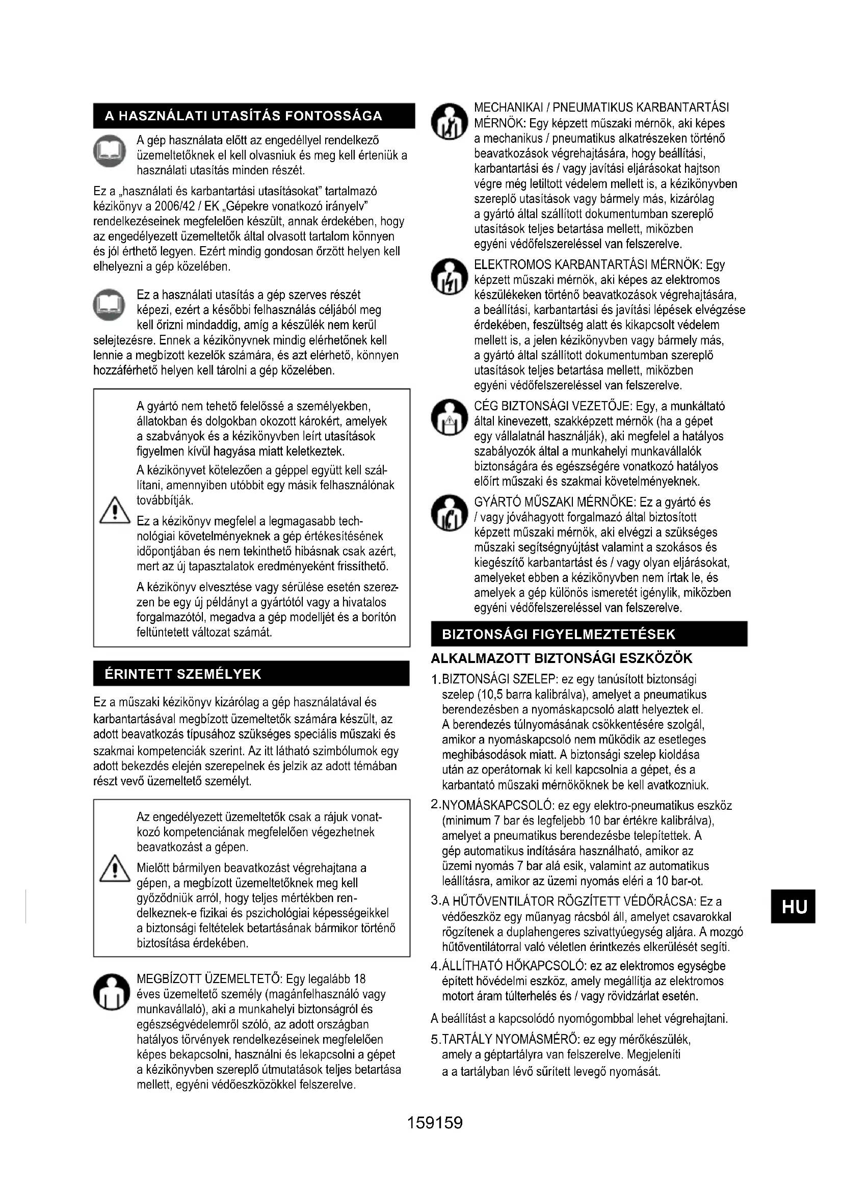 MÉRNÖK: Egy képzett műszaki mérnök, aki képes a mechanikus / pneumatikus alkatrészeken történő beavatkozások végrehajtására, hogy beállítási, karbantartási és / vagy javítási eljárásokat hajtson végre még letiltott védelem mellett is, a kézikönyvben szereplő utasítások vagy bármely más, kizárólag a gyártó által szállított dokumentumban szereplő utasítások teljes betartása mellett, miközben egyéni védőfelszereléssel van felszerelve. ELEKTROMOS KARBANTARTÁSI MÉRNÖK: Egy képzett műszaki mérnök, aki képes az elektromos készülékeken történő beavatkozások végrehajtására, a beállítási, karbantartási és javítási lépések elvégzése érdekében, feszültség alatt és kikapcsolt védelem mellett is, a jelen kézikönyvben vagy bármely más, a gyártó által szállított dokumentumban szereplő utasítások teljes betartása mellett, miközben egyéni védőfelszereléssel van felszerelve. CÉG BIZTONSÁGI VEZETŐJE: Egy, a munkáltató által kinevezett, szakképzett mérnök (ha a gépet egy vállalatnál használják), aki megfelel a hatályos szabályozók által a munkahelyi munkavállalók biztonságára és egészségére vonatkozó hatályos előírt műszaki és szakmai követelményeknek. GYÁRTÓ MŰSZAKI MÉRNÖKE: Ez a gyártó és / vagy jóváhagyott forgalmazó által biztosított képzett műszaki mérnök, aki elvégzi a szükséges műszaki segítségnyújtást valamint a szokásos és kiegészítő karbantartást és / vagy olyan eljárásokat, amelyeket ebben a kézikönyvben nem írtak le, és amelyek a gép különös ismeretét igénylik, miközben egyéni védőfelszereléssel van felszerelve. Ez a használati utasítás a gép szerves részét képezi, ezért a későbbi felhasználás céljából meg kell őrizni mindaddig, amíg a készülék nem kerül selejtezésre. Ennek a kézikönyvnek mindig elérhetőnek kell lennie a megbízott kezelők számára, és azt elérhető, könnyen hozzáférhető helyen kell tárolni a gép közelében. A gép használata előtt az engedéllyel rendelkező üzemeltetőknek el kell olvasniuk és meg kell érteniük a használati utasítás minden részét. Ez a „használati és karbantartási utasításokat” tartalmazó kézikönyv a 2006/42 / EK „Gépekre vonatkozó irányelv” rendelkezéseinek megfelelően készült, annak érdekében, hogy az engedélyezett üzemeltetők által olvasott tartalom könnyen és jól érthető legyen. Ezért mindig gondosan őrzött helyen kell elhelyezni a gép közelében. A HASZNÁLATI UTASÍTÁS FONTOSSÁGA