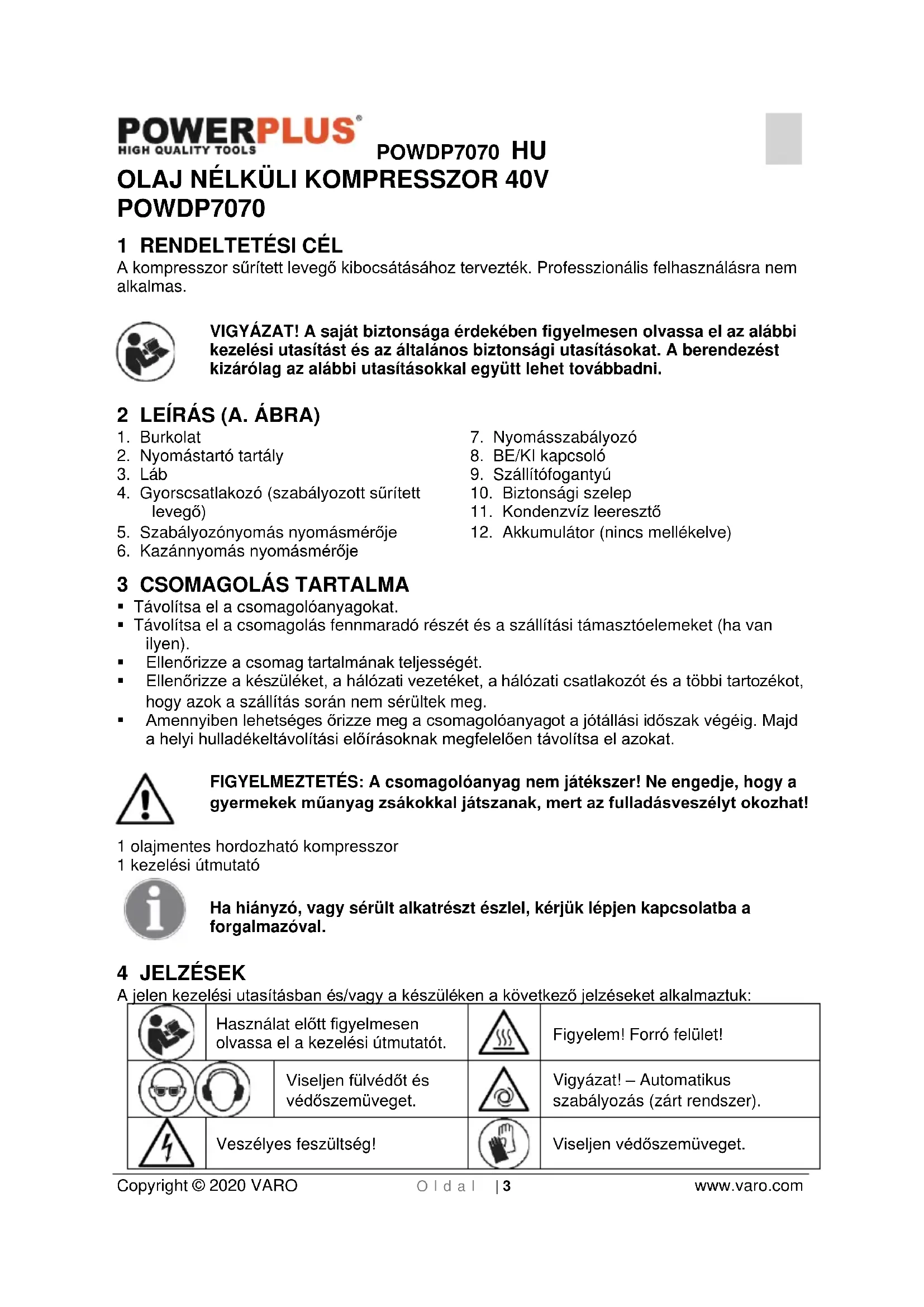 Töltse le az útmutatót a következőhöz Kompresszor PDF formátumban ingyenesen! Találja meg kézikönyvét POWDP7070 - PowerPlus és vegye vissza elektronikus eszközét a kezébe. Ezen az oldalon közzé van téve az eszköze használatához szükséges összes dokumentum. POWDP7070 márka PowerPlus.