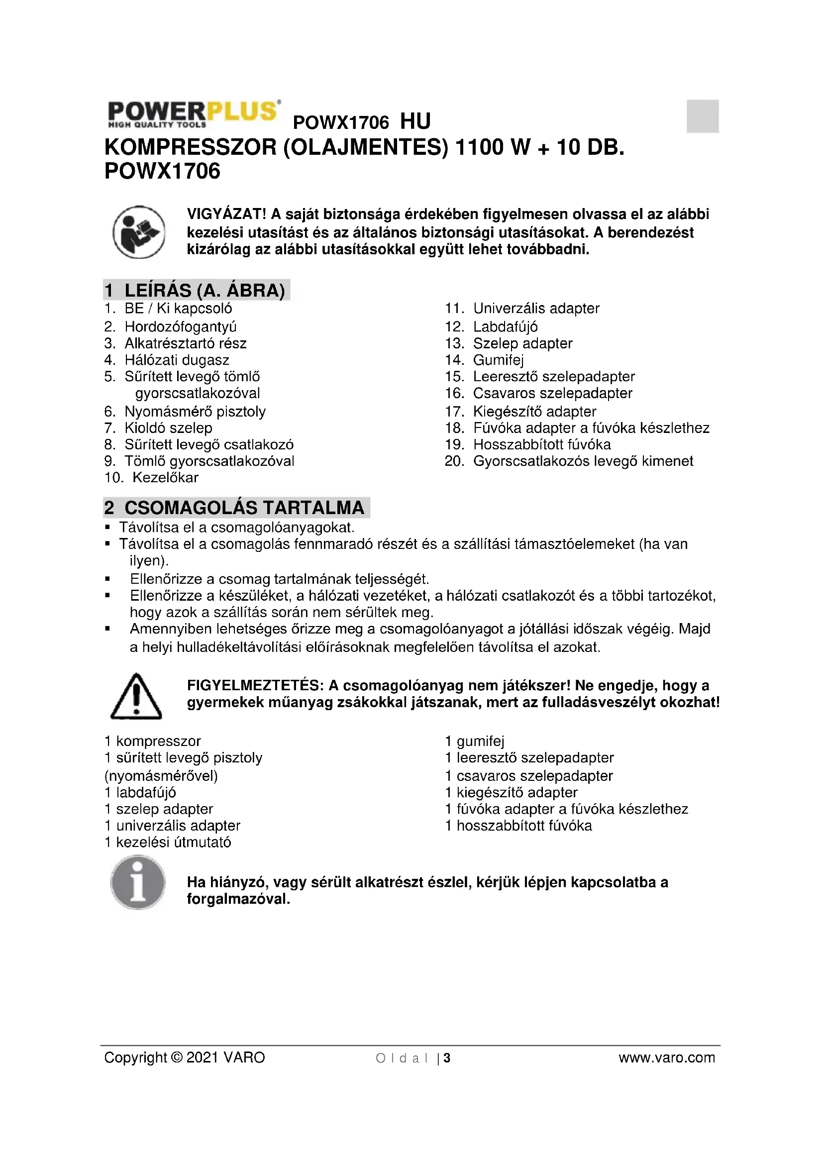 Copyright © 2021 VARO O l d a l | 3 www.varo.com KOMPRESSZOR (OLAJMENTES) 1100 W + 10 DB. POWX1706 VIGYÁZAT! A saját biztonsága érdekében figyelmesen olvassa el az alábbi kezelési utasítást és az általános biztonsági utasításokat. A berendezést kizárólag az alábbi utasításokkal együtt lehet továbbadni. 1 LEÍRÁS (A. ÁBRA)