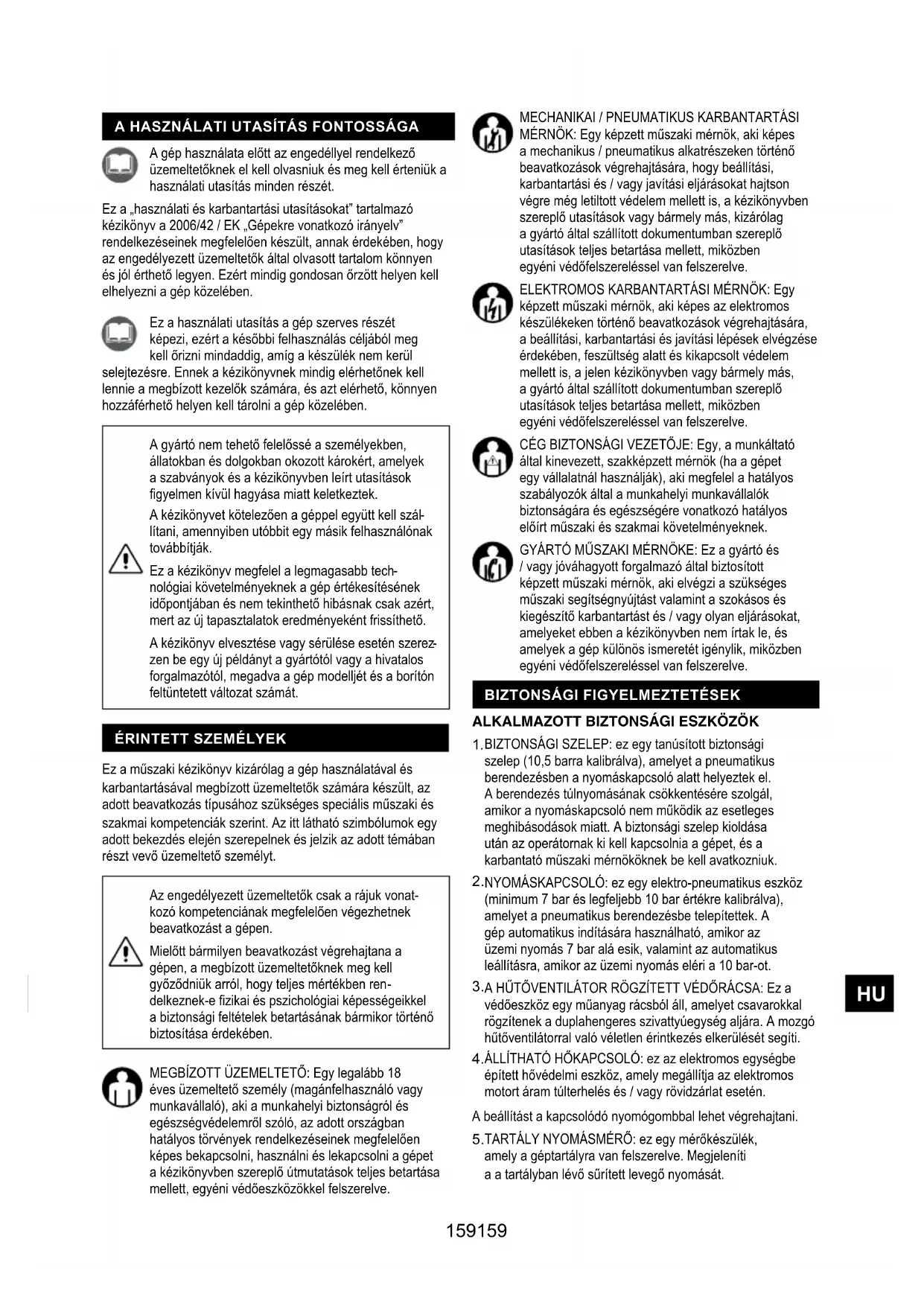 MÉRNÖK: Egy képzett műszaki mérnök, aki képes a mechanikus / pneumatikus alkatrészeken történő beavatkozások végrehajtására, hogy beállítási, karbantartási és / vagy javítási eljárásokat hajtson végre még letiltott védelem mellett is, a kézikönyvben szereplő utasítások vagy bármely más, kizárólag a gyártó által szállított dokumentumban szereplő utasítások teljes betartása mellett, miközben egyéni védőfelszereléssel van felszerelve. ELEKTROMOS KARBANTARTÁSI MÉRNÖK: Egy képzett műszaki mérnök, aki képes az elektromos készülékeken történő beavatkozások végrehajtására, a beállítási, karbantartási és javítási lépések elvégzése érdekében, feszültség alatt és kikapcsolt védelem mellett is, a jelen kézikönyvben vagy bármely más, a gyártó által szállított dokumentumban szereplő utasítások teljes betartása mellett, miközben egyéni védőfelszereléssel van felszerelve. CÉG BIZTONSÁGI VEZETŐJE: Egy, a munkáltató által kinevezett, szakképzett mérnök (ha a gépet egy vállalatnál használják), aki megfelel a hatályos szabályozók által a munkahelyi munkavállalók biztonságára és egészségére vonatkozó hatályos előírt műszaki és szakmai követelményeknek. GYÁRTÓ MŰSZAKI MÉRNÖKE: Ez a gyártó és / vagy jóváhagyott forgalmazó által biztosított képzett műszaki mérnök, aki elvégzi a szükséges műszaki segítségnyújtást valamint a szokásos és kiegészítő karbantartást és / vagy olyan eljárásokat, amelyeket ebben a kézikönyvben nem írtak le, és amelyek a gép különös ismeretét igénylik, miközben egyéni védőfelszereléssel van felszerelve. Ez a használati utasítás a gép szerves részét képezi, ezért a későbbi felhasználás céljából meg kell őrizni mindaddig, amíg a készülék nem kerül selejtezésre. Ennek a kézikönyvnek mindig elérhetőnek kell lennie a megbízott kezelők számára, és azt elérhető, könnyen hozzáférhető helyen kell tárolni a gép közelében. A gép használata előtt az engedéllyel rendelkező üzemeltetőknek el kell olvasniuk és meg kell érteniük a használati utasítás minden részét. Ez a „használati és karbantartási utasításokat” tartalmazó kézikönyv a 2006/42 / EK „Gépekre vonatkozó irányelv” rendelkezéseinek megfelelően készült, annak érdekében, hogy az engedélyezett üzemeltetők által olvasott tartalom könnyen és jól érthető legyen. Ezért mindig gondosan őrzött helyen kell elhelyezni a gép közelében. A HASZNÁLATI UTASÍTÁS FONTOSSÁGA