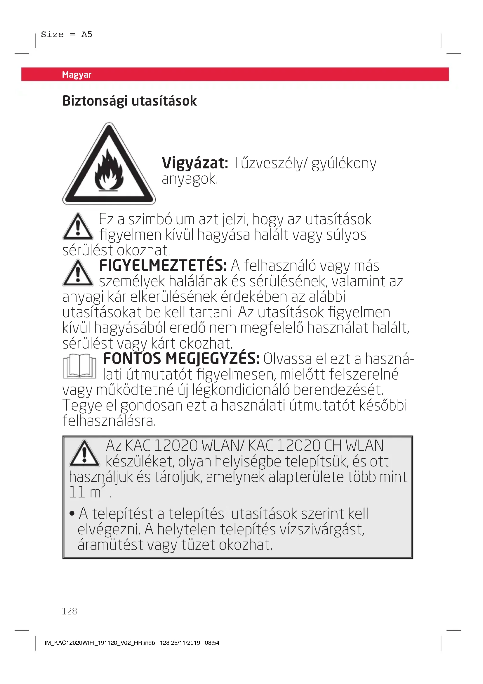 - A telepítést a telepítési utasítások szerint kell elvégezni. A helytelen telepítés vízszivárgást, áramütést vagy tüzet okozhat. IM_KAC12020WIFI_191120_V02_HR.indb 128 25/11/2019 08:54Magyar