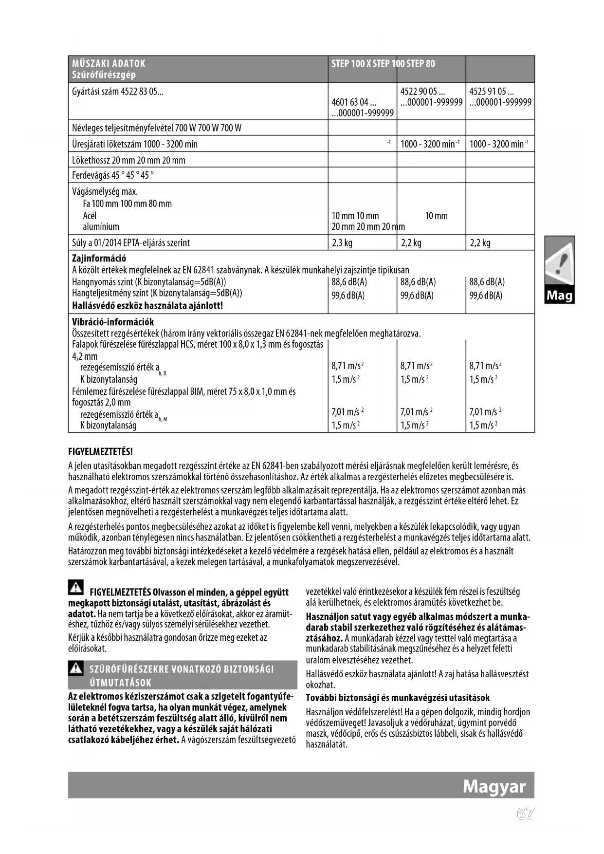 FIGYELMEZTETÉS! A jelen utasításokban megadott rezgésszint értéke az EN 62841-ben szabályozott mérési eljárásnak megfelelően került lemérésre, és használható elektromos szerszámokkal történő összehasonlításhoz. Az érték alkalmas a rezgésterhelés előzetes megbecsülésére is. A megadott rezgésszint-érték az elektromos szerszám legfőbb alkalmazásait reprezentálja. Ha az elektromos szerszámot azonban más alkalmazásokhoz, eltérő használt szerszámokkal vagy nem elegendő karbantartással használják, a rezgésszint értéke eltérő lehet. Ez jelentősen megnövelheti a rezgésterhelést a munkavégzés teljes időtartama alatt. A rezgésterhelés pontos megbecsüléséhez azokat az időket is gyelembe kell venni, melyekben a készülék lekapcsolódik, vagy ugyan működik, azonban ténylegesen nincs használatban. Ez jelentősen csökkentheti a rezgésterhelést a munkavégzés teljes időtartama alatt. Határozzon meg további biztonsági intézkedéseket a kezelő védelmére a rezgések hatása ellen, például az elektromos és a használt szerszámok karbantartásával, a kezek melegen tartásával, a munkafolyamatok megszervezésével. FIGYELMEZTETÉS Olvasson el minden, a géppel együtt megkapott biztonsági utalást, utasítást, ábrázolást és adatot. Ha nem tartja be a következő előírásokat, akkor ez áramüt- éshez, tűzhöz és/vagy súlyos személyi sérülésekhez vezethet. Kérjük a későbbi használatra gondosan őrizze meg ezeket az előírásokat. SZÚRÓFŰRÉSZEKRE VONATKOZÓ BIZTONSÁGI ÚTMUTATÁSOK Az elektromos kéziszerszámot csak a szigetelt fogantyúfe- lületeknél fogva tartsa, ha olyan munkát végez, amelynek során a betétszerszám feszültség alatt álló, kívülről nem látható vezetékekhez, vagy a készülék saját hálózati csatlakozó kábeljéhez érhet. A vágószerszám feszültségvezető vezetékkel való érintkezésekor a készülék fém részei is feszültség alá kerülhetnek, és elektromos áramütés következhet be. Használjon satut vagy egyéb alkalmas módszert a munka- darab stabil szerkezethez való rögzítéséhez és alátámas- ztásához. A munkadarab kézzel vagy testtel való megtartása a munkadarab stabilitásának megszűnéséhez és a helyzet feletti uralom elvesztéséhez vezethet. Hallásvédő eszköz használata ajánlott! A zaj hatása hallásvesztést okozhat. További biztonsági és munkavégzési utasítások Használjon védőfelszerelést! Ha a gépen dolgozik, mindig hordjon védőszemüveget! Javasoljuk a védőruházat, úgymint porvédő maszk, védőcipő, erős és csúszásbiztos lábbeli, sisak és hallásvédő használatát. Mag6868 Magyar A munkavégzéskor keletkező por az egészségre ártalmas lehet. Ilyen esetben ajánlatos a megfelelő elszívó berendezés és a védőmaszk használata. A munkaterületen lerakódott port alaposan el kell takarítani. Nem szabad olyan anyagokat megmunkálni, amelyek egészségre veszélyesek (pl. azbesztet). A betétszerszám elakadásakor azonnal ki kell kapcsolni a készü- léket! Addig ne kapcsolja vissza a készüléket, amíg a betétszerszám elakadása fennáll; ennek során nagy ellennyomatékú visszarúgás történhet.Határozza és szüntesse meg a betétszerszám elaka- dásának okát a biztonsági útmutatások betartása mellett. Ennek a következők lehetnek az okai: