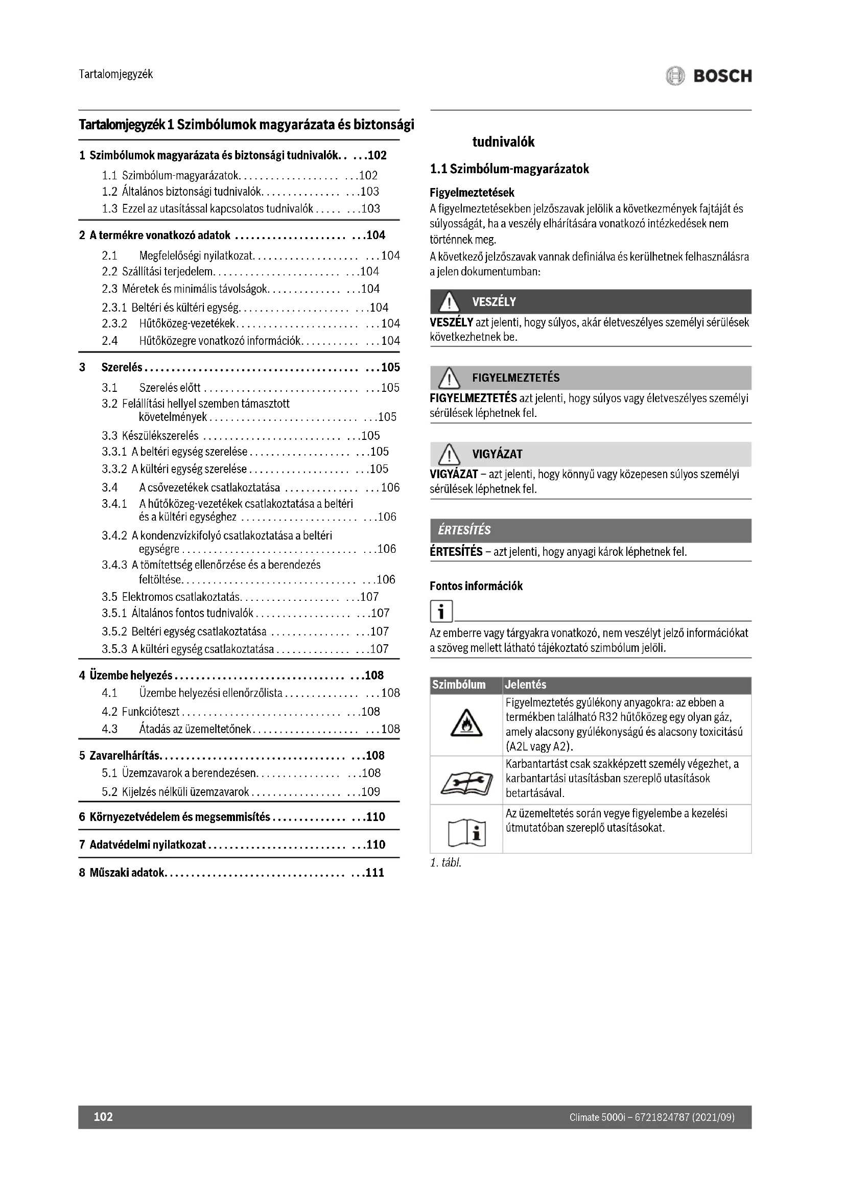 1 Szimbólumok magyarázata és biztonsági tudnivalók. . . . .102