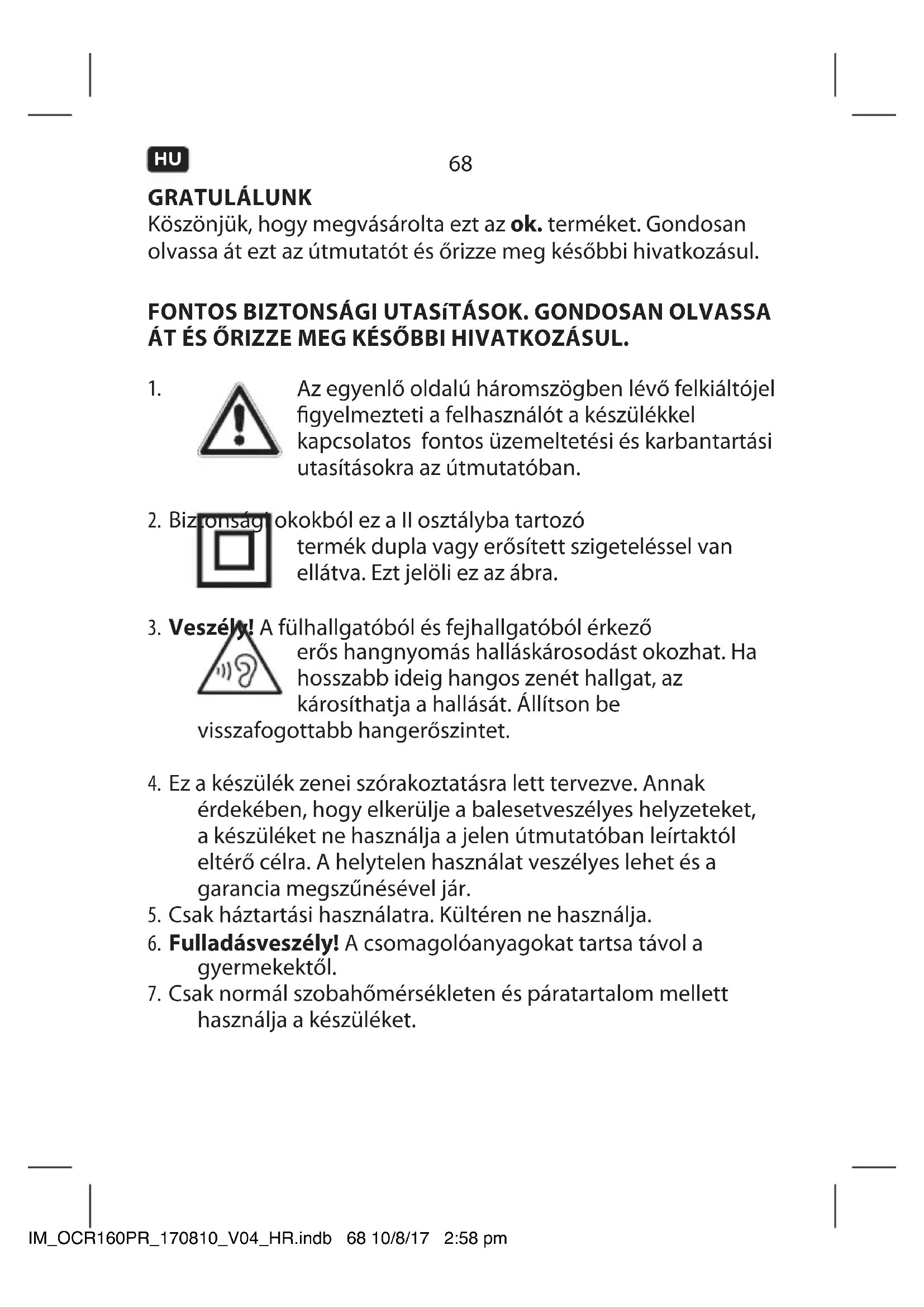 Áramellátás : 230 - 240 V~, 50 Hz Energiafelhasználás működés közben : 4 W Energiafelhasználás készenlétkor : ≤1 W Működés tartalék elemről : 2 x 1,5 V (Typ LR03/AAA) Frekvenciatartomány : 87,5 - 108 MHz Hangolási lépésköz : 0,1 MHz Védelmi osztály : II ÁRTALMATLANíTÁS Ne dobja a készüléket ártalmatlanítás céljából a háztartási hulladékok közé. Vigye el egy, a villamos és elektronikus felszerelések újrahasznosítására kijelölt gyűjtőpontra. További információért kérjük, lépjen kapcsolatba a kiskereskedővel vagy a helyi hatóságokkal. Az elemek megsemmisítését végezze környezetbarát módon. Ne dobja az elemeket a háztartási hulladékok közé. Használja a helyi ártalmatlanító-begyűjtő rendszert, vagy kérje ki kereskedőjének tanácsát. IM_OCR160PR_170810_V04_HR.indb 80 10/8/17 2:58 pm81