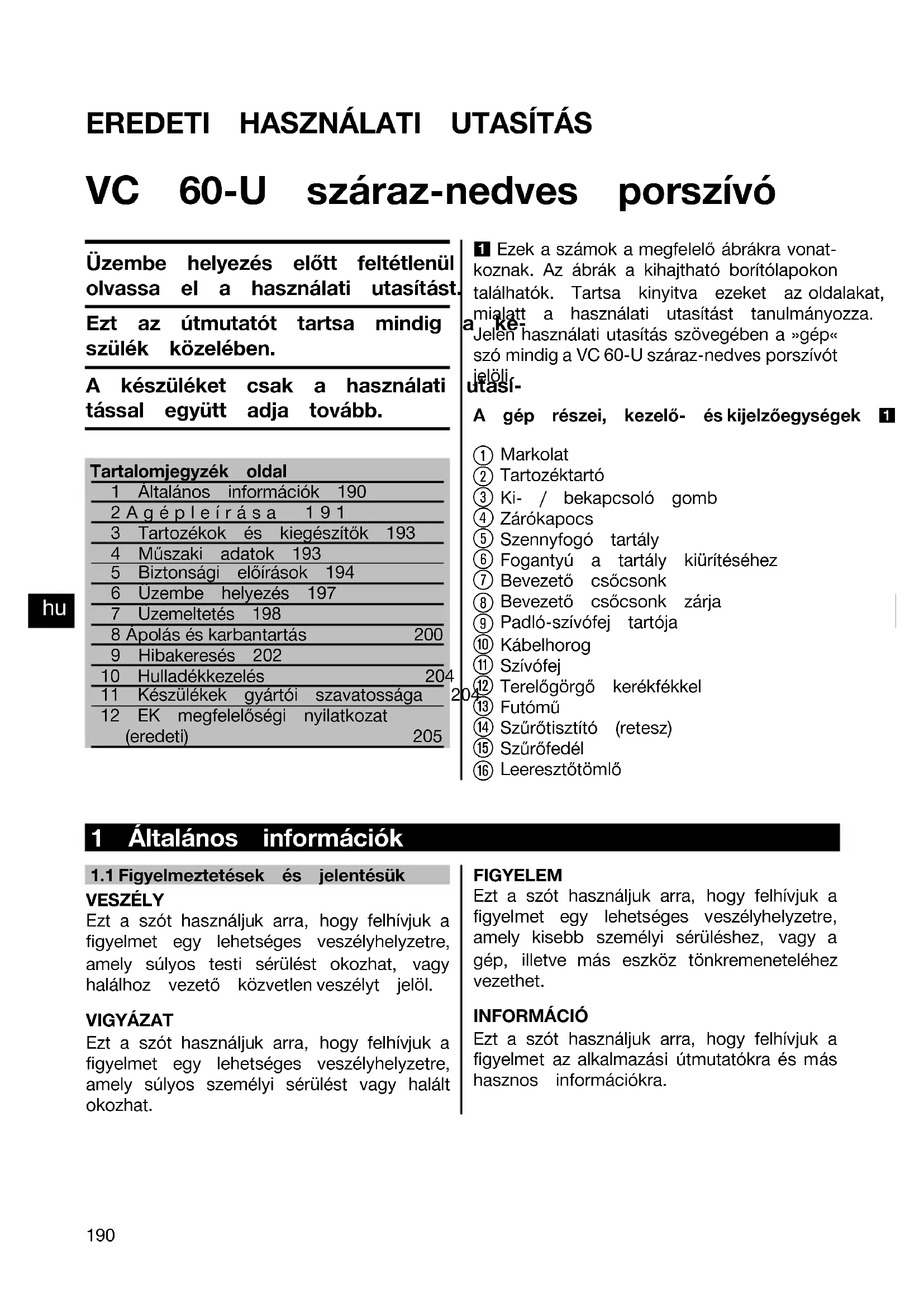 Printed: 05.12.2013 | Doc-Nr: PUB / 5071295 / 000 / 02EREDETI HASZNÁLATI UTASÍTÁS VC 60‑U száraz-nedves porszívó Üzembe helyezés előtt feltétlenülolvassa el a használati utasítást.Ezt az útmutatót tartsa mindig a ké-szülék közelében.A készüléket csak a használati utasí-tással együtt adja tovább.Tartalomjegyzék oldal1 Általános információk 1902Agépleírása 1913 Tartozékok és kiegészítők 1934 Műszaki adatok 1935 Biztonsági előírások 1946 Üzembe helyezés 1977 Üzemeltetés 198 8Ápoláséskarbantartás 200 9 Hibakeresés 20210 Hulladékkezelés 20411 Készülékek gyártói szavatossága 20412 EK megfelelőségi nyilatkozat(eredeti) 205 1 Ezek a számok a megfelelő ábrákra vonat- koznak. Az ábrák a kihajtható borítólapokon találhatók. Tartsa kinyitva ezeket az oldalakat,mialatt a használati utasítást tanulmányozza. Jelen használati utasítás szövegében a »gép« szó mindig a VC 60-U száraz-nedves porszívót jelöli.A gép részei, kezelő- és kijelzőegységek 1 Markolat Tartozéktartó Ki- / bekapcsoló gomb Zárókapocs Szennyfogó tartály Fogantyú a tartály kiürítéséhez Bevezető csőcsonk Bevezető csőcsonk zárja Padló-szívófej tartója Kábelhorog Szívófej Terelőgörgő kerékfékkel Futómű Szűrőtisztító (retesz) Szűrőfedél Leeresztőtömlő 1 Általános információk
