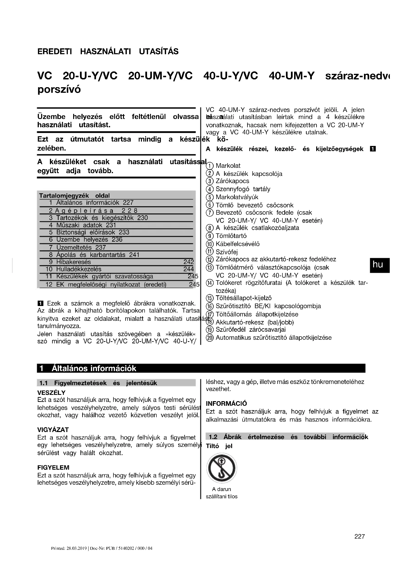 Printed: 24.03.2014 | Doc-Nr: PUB / 5140202 / 000 / 03 Printed: 28.03.2019 | Doc-Nr: PUB / 5140202 / 000 / 04EREDETI HASZNÁLATI UTASÍTÁS VC 20-U‑Y/VC 20-UM‑Y/VC 40-U‑Y/VC 40-UM‑Y száraz-nedves porszívó Üzembe helyezés előtt feltétlenül olvassa el a használati utasítást. Ezt az útmutatót tartsa mindig a készülék kö- zelében. A készüléket csak a használati utasítással együtt adja tovább. Tartalomjegyzék oldal1 Általános információk 2272Agépleírása 2283 Tartozékok és kiegészítők 2304 Műszaki adatok 2315 Biztonsági előírások 2336 Üzembe helyezés 2367 Üzemeltetés 2378 Ápolás és karbantartás 2419 Hibakeresés 24210 Hulladékkezelés 24411 Készülékek gyártói szavatossága 24512 EK megfelelőségi nyilatkozat (eredeti) 245 1 Ezek a számok a megfelelő ábrákra vonatkoznak. Az ábrák a kihajtható borítólapokon találhatók. Tartsakinyitva ezeket az oldalakat, mialatt a használati utasításttanulmányozza. Jelen használati utasítás szövegében a »készülék« szó mindig a VC 20‑U‑Y/VC 20‑UM‑Y/VC 40‑U‑Y/ VC 40‑UM‑Y száraz-nedves porszívót jelöli. A jelen használati utasításban leírtak mind a 4 készülékre vonatkoznak, hacsak nem kifejezetten a VC 20‑UM-Y vagy a VC 40‑UM-Y készülékre utalnak.A készülék részei, kezelő- és kijelzőegységek 1 Markolat A készülék kapcsolója Zárókapocs Szennyfogó tartály Markolatvályúk Tömlő bevezető csőcsonk Bevezető csőcsonk fedele (csakVC 20‑UM‑Y/ VC 40‑UM‑Y esetén) A készülék csatlakozóaljzata Tömlőtartó Kábelfelcsévélő Szívófej