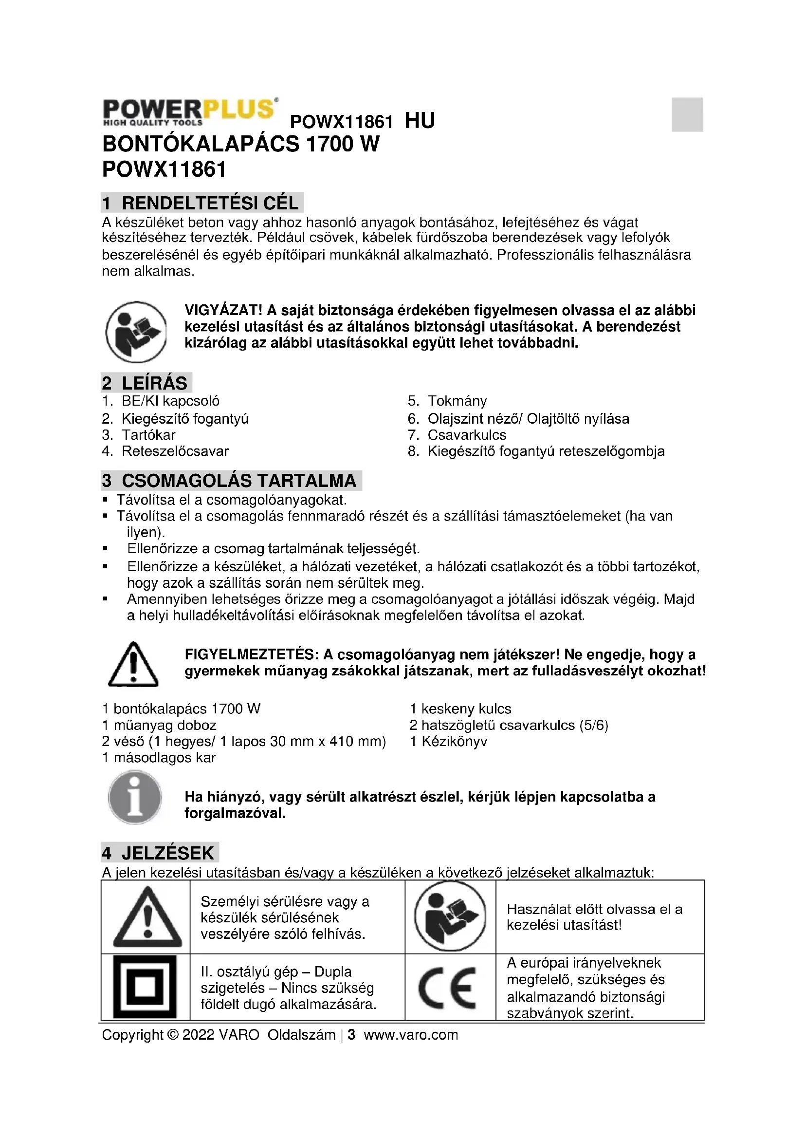 A európai irányelveknek megfelelő, szükséges és alkalmazandó biztonsági szabványok szerint.POWX11861 HU Copyright © 2022 VARO Oldalszám | 4 www.varo.com