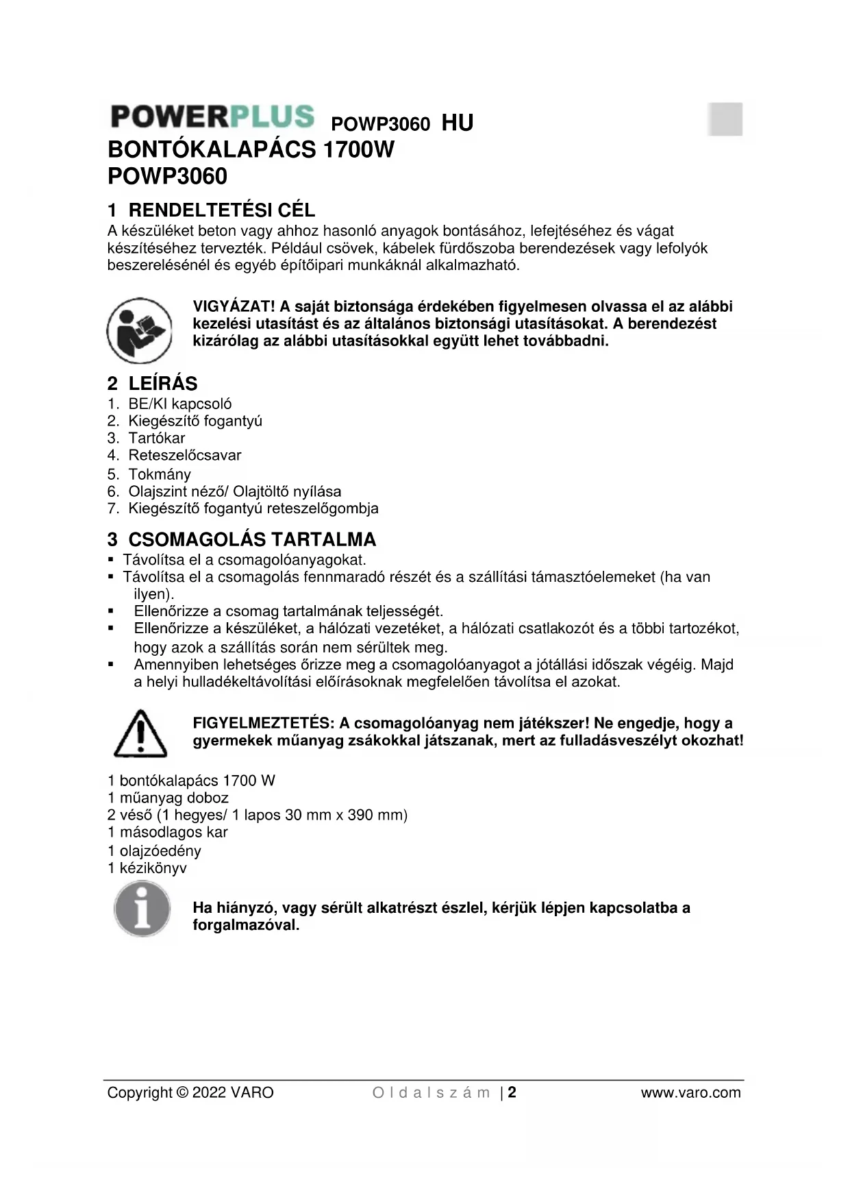 Olvasson el minden biztonsági figyelmeztetést és minden utasítást. A figyelmeztetések és utasítások betartásának elmulasztása áramütést, tüzet és/vagy súlyos sérülést okozhat. Őrizze meg a figyelmeztetések és utasítások leírását jövőbeni hivatkozás céljából. A figyelmeztetésekben előforduló berendezés (power tool) kifejezés a hálózatról működtetett (vezetékes) berendezésre, vagy az elemes (vezetékmentes) berendezésre utal.POWP3060 HU Copyright © 2022 VARO O l d a l s z á m | 4 www.varo.com