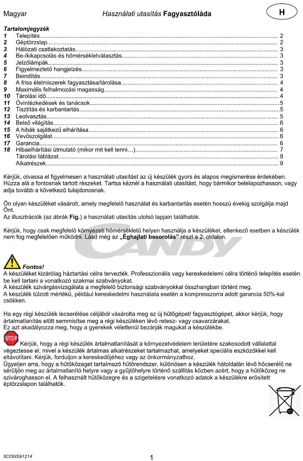 Fontos! A készüléket kizárólag háztartási célra tervezték. Professzionális vagy kereskedelemi célra történ telepítés esetén be kell tartani a vonatkozó szakmai szabványokat. A készülék szivárgásvizsgálata a megfelel biztonsági szabványokkal összhangban történt meg. A készülék túlzott mérték, például kereskedelmi használata esetén a kompresszorra adott garancia 50%-kal csökken. Ha egy régi készülék lecserélése céljából vásárolta meg az új htgépet/ fagyasztógépet, akkor kérjük, hogy ártalmatlanítás eltt semmisítse meg a régi készüléken lév retesz- vagy csavarzárakat. Ez azt akadályozza meg, hogy a gyerekek véletlenül bezárják magukat a készülékbe. Kérjük, hogy a régi készülék ártalmatlanítását a környezetvédelem területére szakosodott vállalattal végeztesse el, mivel a készülék ártalmas alkatrészeket tartalmazhat, amelyeket speciális eszközökkel kell eltávolítani. Kérjük, forduljon a kereskedjéhez vagy az önkormányzathoz. Ügyeljen arra, hogy a htközeget tartalmazó htrendszer, különösen a készülék hátoldalán lév hcserél ne sérüljön meg az ártalmatlanító helyre vagy a gyjthelyre történ szállítás közben azért, hogy a htközeg ne szivároghasson el. A felhasznált htközegre és a szigetelésre vonatkozó adatok a készülékre ersített éptörzslapon találhatók.Magyar Használati utasítás Fagyasztóláda fiCONS91214