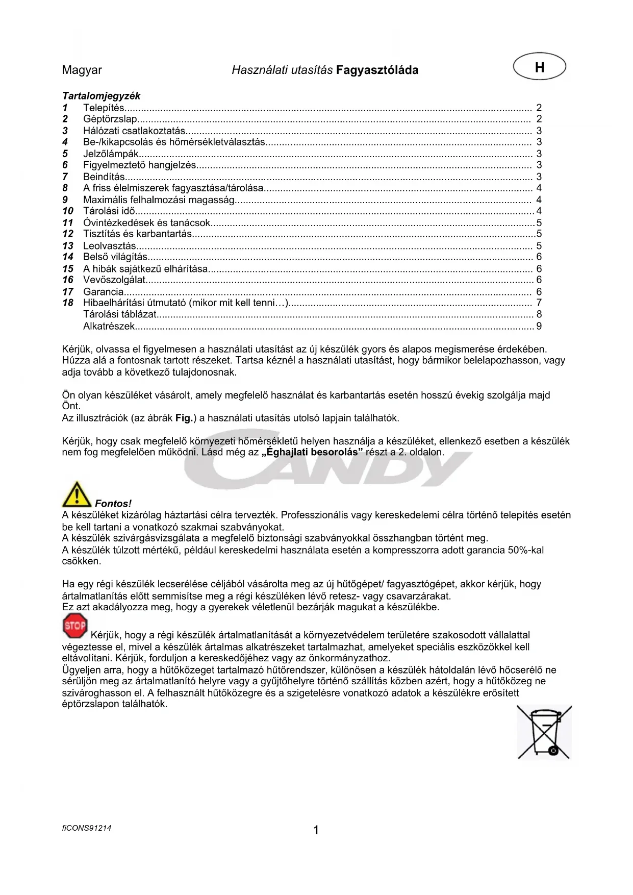 Fontos! A készüléket kizárólag háztartási célra tervezték. Professzionális vagy kereskedelemi célra történ telepítés esetén be kell tartani a vonatkozó szakmai szabványokat. A készülék szivárgásvizsgálata a megfelel biztonsági szabványokkal összhangban történt meg. A készülék túlzott mérték, például kereskedelmi használata esetén a kompresszorra adott garancia 50%-kal csökken. Ha egy régi készülék lecserélése céljából vásárolta meg az új htgépet/ fagyasztógépet, akkor kérjük, hogy ártalmatlanítás eltt semmisítse meg a régi készüléken lév retesz- vagy csavarzárakat. Ez azt akadályozza meg, hogy a gyerekek véletlenül bezárják magukat a készülékbe. Kérjük, hogy a régi készülék ártalmatlanítását a környezetvédelem területére szakosodott vállalattal végeztesse el, mivel a készülék ártalmas alkatrészeket tartalmazhat, amelyeket speciális eszközökkel kell eltávolítani. Kérjük, forduljon a kereskedjéhez vagy az önkormányzathoz. Ügyeljen arra, hogy a htközeget tartalmazó htrendszer, különösen a készülék hátoldalán lév hcserél ne sérüljön meg az ártalmatlanító helyre vagy a gyjthelyre történ szállítás közben azért, hogy a htközeg ne szivároghasson el. A felhasznált htközegre és a szigetelésre vonatkozó adatok a készülékre ersített éptörzslapon találhatók.Magyar Használati utasítás Fagyasztóláda fiCONS91214