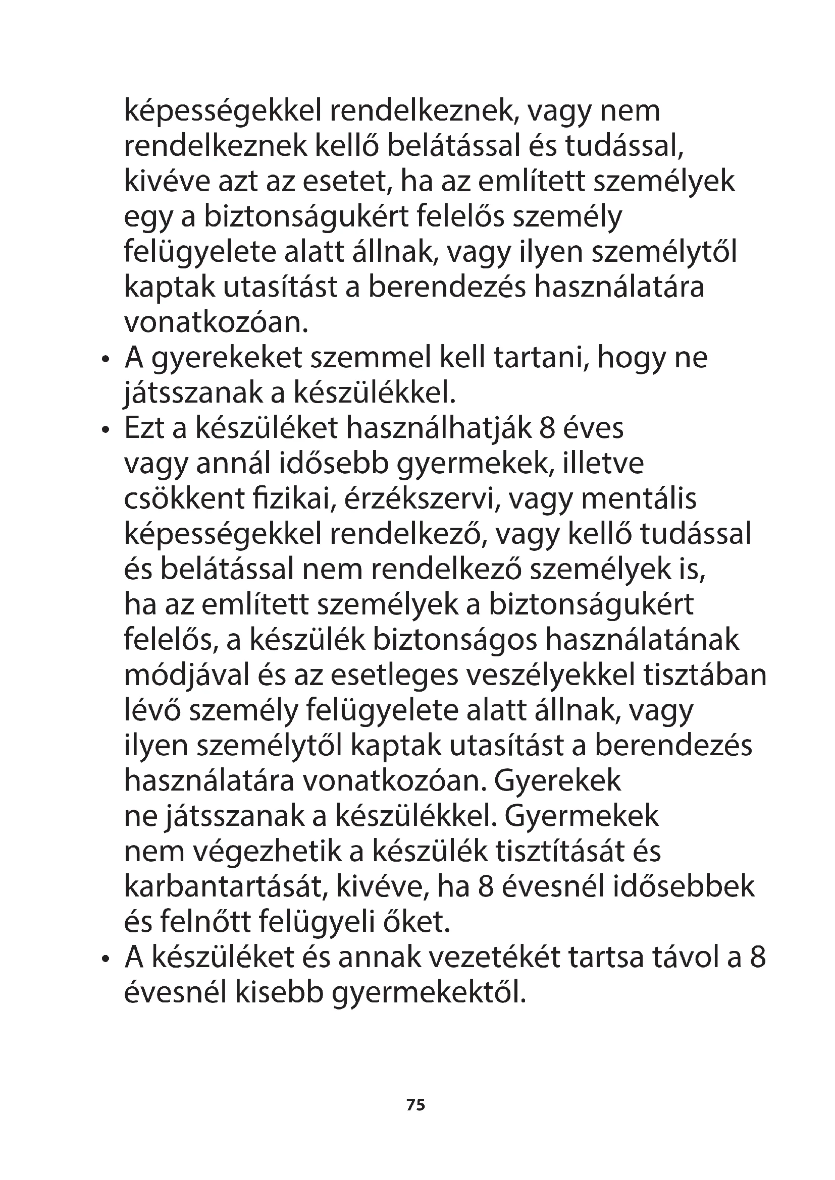 - Ezt a berendezést nem használhatják olyan személyek (gyermekeket is beleértve), akik csökkent zikai, érzékszervi vagy szellemi75 képességekkel rendelkeznek, vagy nem rendelkeznek kellő belátással és tudással, kivéve azt az esetet, ha az említett személyek egy a biztonságukért felelős személy felügyelete alatt állnak, vagy ilyen személytől kaptak utasítást a berendezés használatára vonatkozóan.