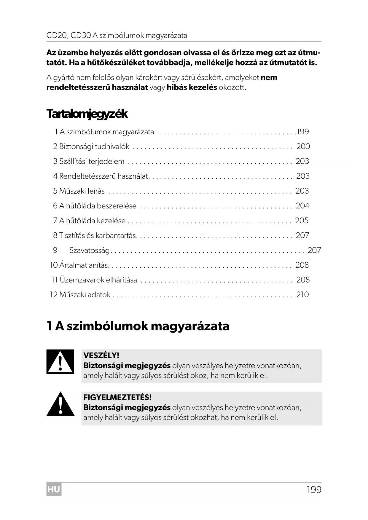 - Az üzembe helyezés előtt gondosan olvassa el és őrizze meg ezt az útmu- tatót. Ha a hűtőkészüléket továbbadja, mellékelje hozzá az útmutatót is. A gyártó nem felelős olyan károkért vagy sérülésekért, amelyeket nem rendeltetésszerű használat vagy hibás kezelés okozott. Tartalomjegyz ék 1 A szimbólumok magyarázata p. 199