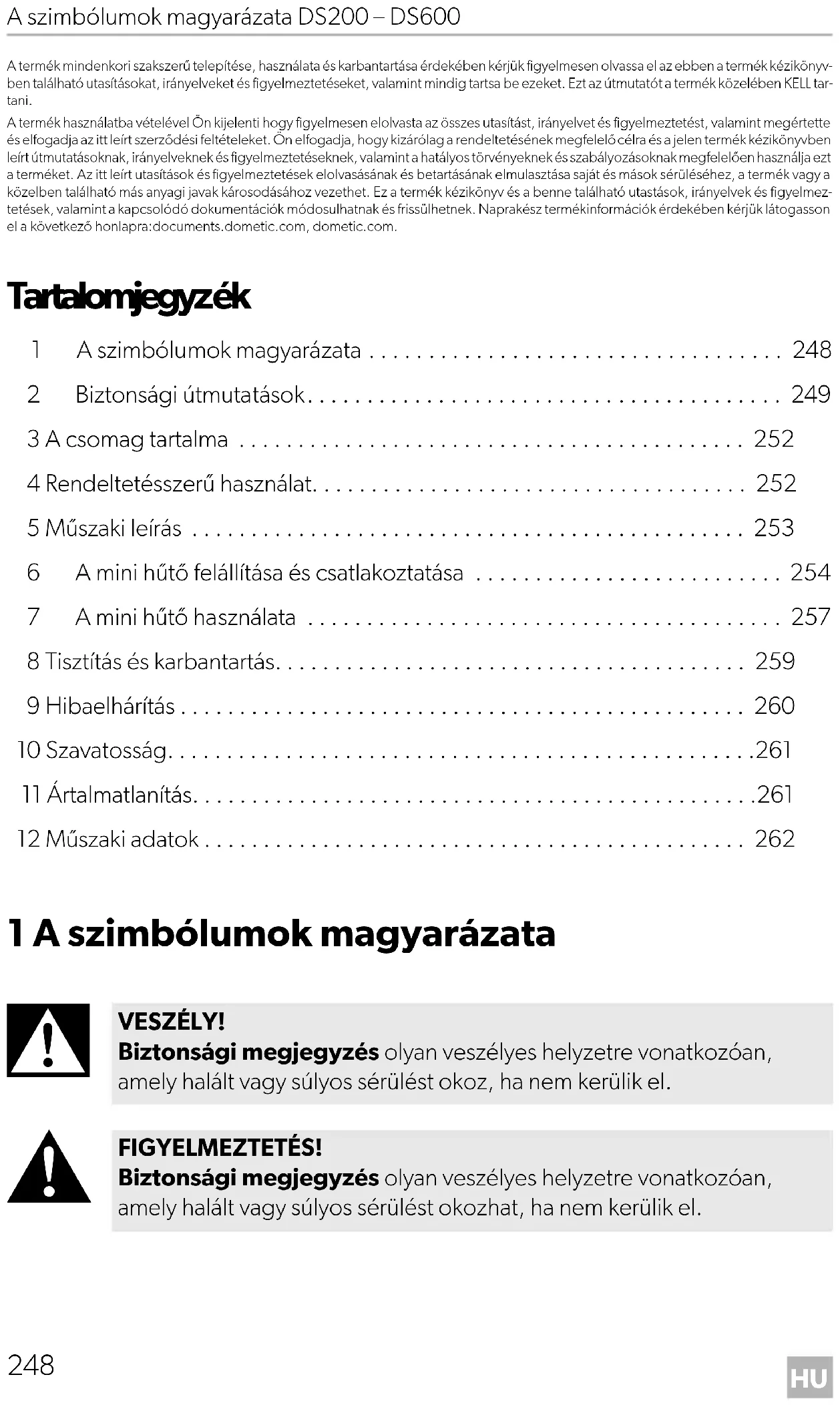 - Ne tároljon a mini hűtőben robbanásveszélyes anyagokat, például gyúlékony hajtógázt tartalmazó spray-palackokat. VIGYÁZAT! Biztonsági megjegyzés olyan veszélyes helyzetre vonatkozóan, amely könnyű vagy közepesen súlyos sérülést okozhat, ha nem kerülik el. FIGYELEM! Felhívás olyan helyzetre, amely dologi kárt okozhat, ha nem kerülik el. MEGJEGYZÉS A termék kezelésére vonatkozó kiegészítő információk. DometicDS200-300-400-600_IOM_4445103315_EMEA16_2020-xx-xx.book Seite 249 Mittwoch, 3. März 2021 11:36 11HU Biztonsági útmutatások DS200 – DS600