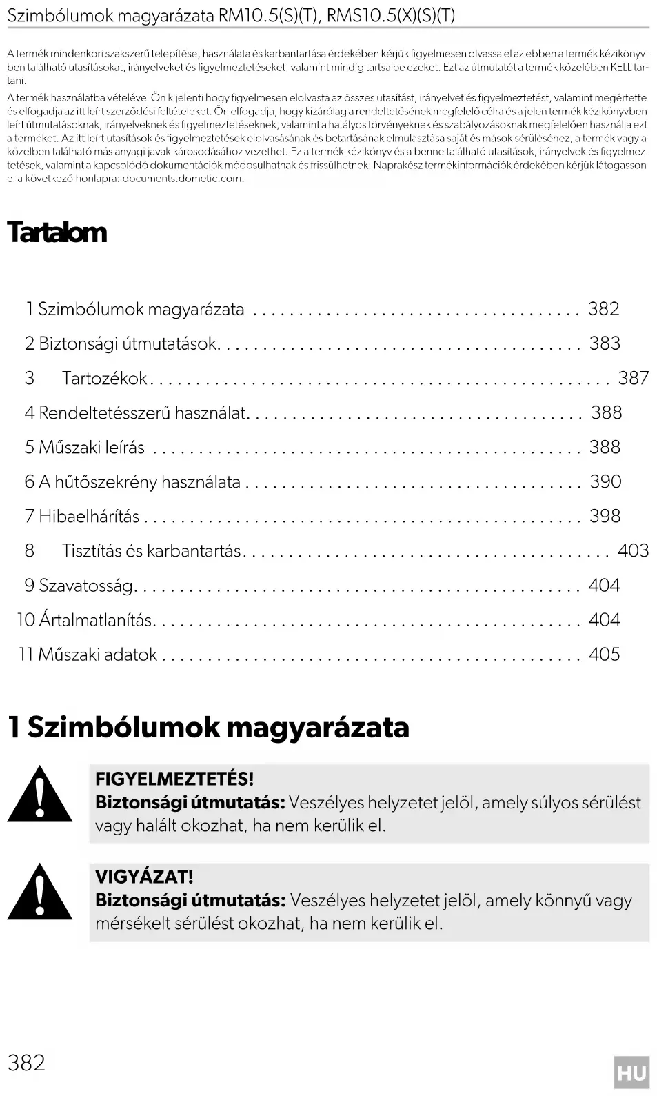 FIGYELMEZTETÉS! Biztonsági útmutatás: Veszélyes helyzetet jelöl, amely súlyos sérülést vagy halált okozhat, ha nem kerülik el. VIGYÁZAT! Biztonsági útmutatás: Veszélyes helyzetet jelöl, amely könnyű vagy mérsékelt sérülést okozhat, ha nem kerülik el.HU RM10.5(S)(T), RMS10.5(X)(S)(T) Biztonsági útmutatások