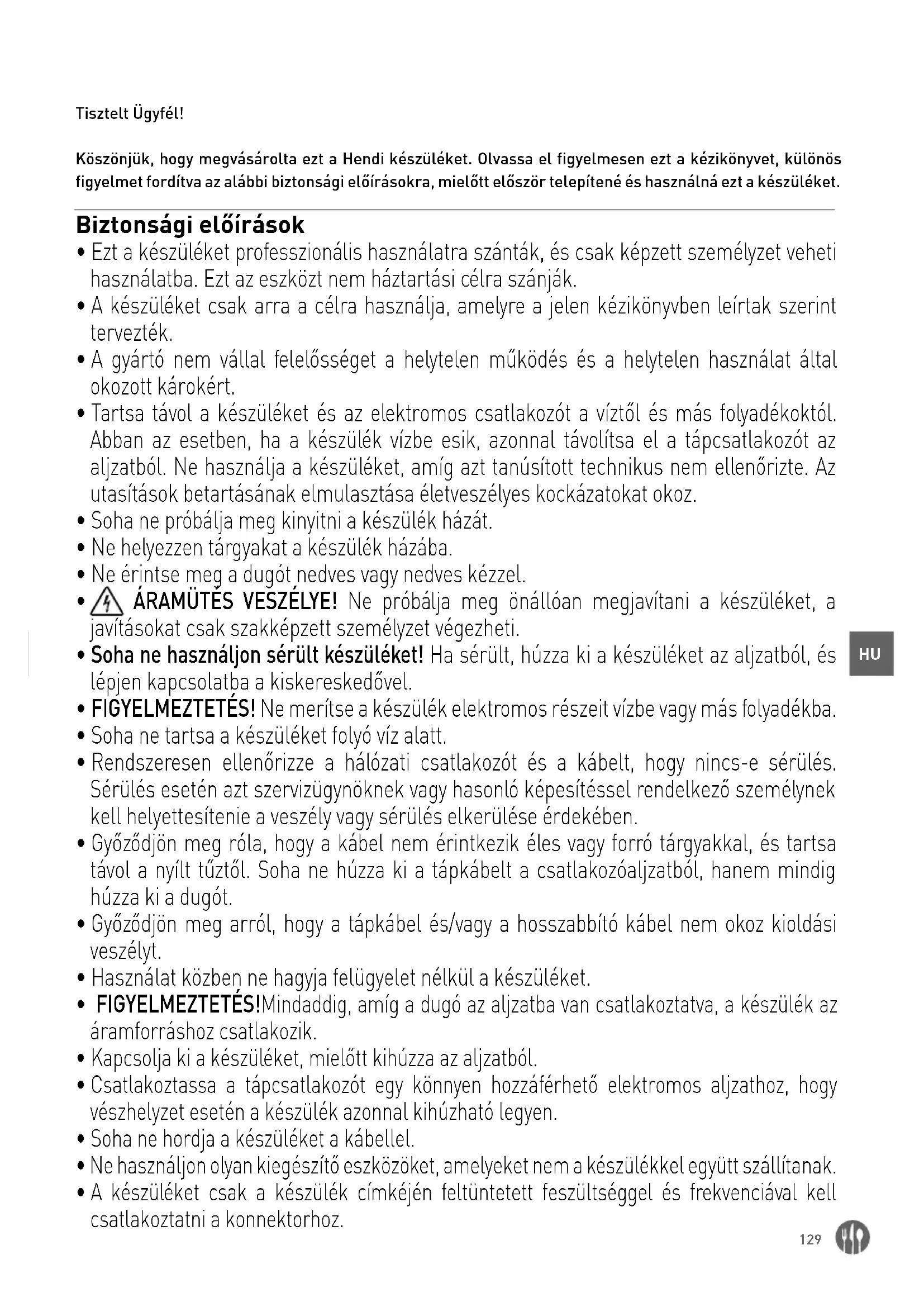 Tisztelt Ügyfél! Köszönjük, hogy megvásárolta ezt a Hendi készüléket. Olvassa el figyelmesen ezt a kézikönyvet, különös figyelmet fordítva az alábbi biztonsági előírásokra, mielőtt először telepítené és használná ezt a készüléket. Biztonsági előírások