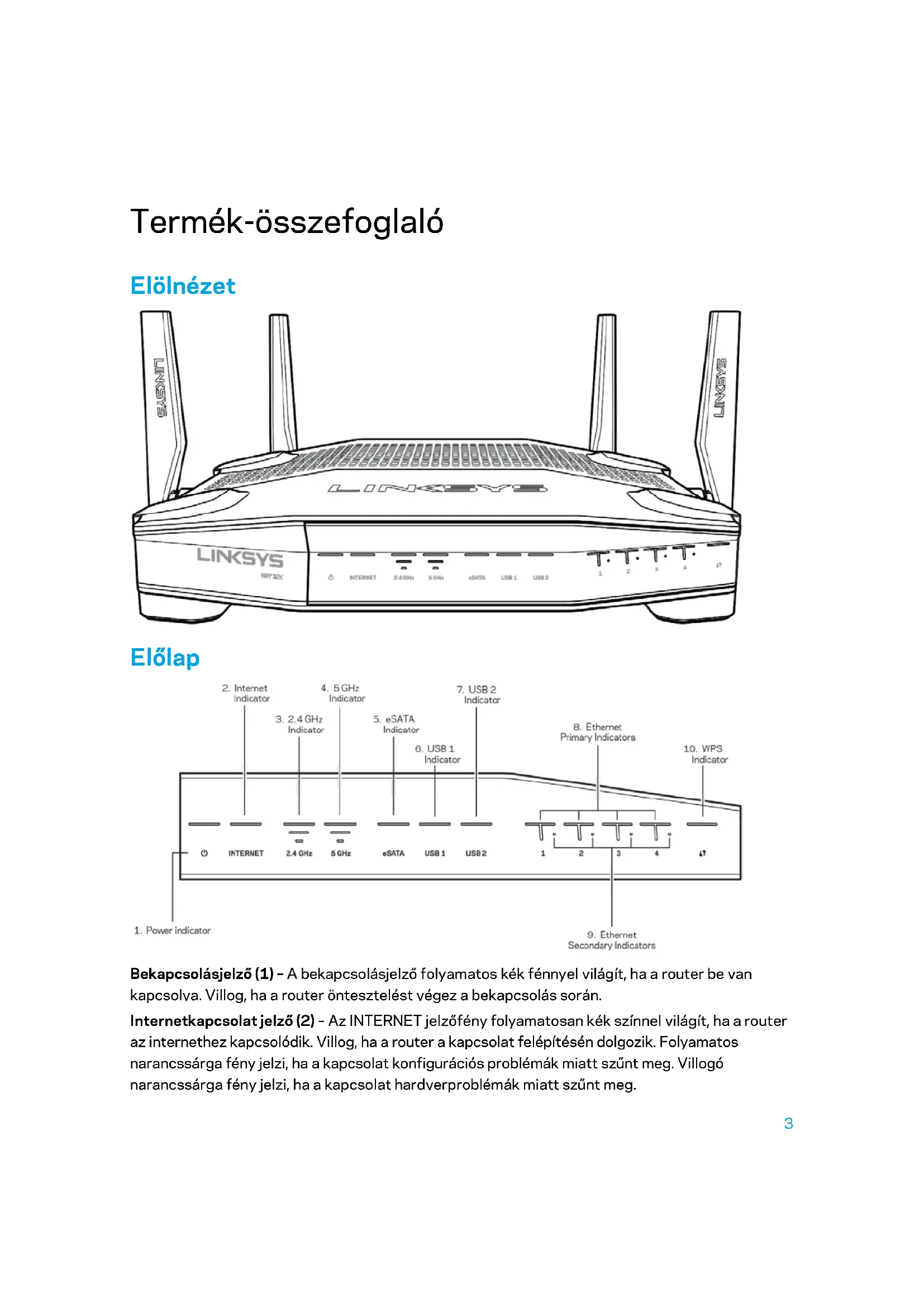 - Beépítési adatok Termék-összefoglaló Elölnézet Előlap Bekapcsolásjelző (1) – A bekapcsolásjelző folyamatos kék fénnyel világít, ha a router be van kapcsolva. Villog, ha a router öntesztelést végez a bekapcsolás során. Internetkapcsolat jelző (2) – Az INTERNET jelzőfény folyamatosan kék színnel világít, ha a router az internethez kapcsolódik. Villog, ha a router a kapcsolat felépítésén dolgozik. Folyamatos narancssárga fény jelzi, ha a kapcsolat konfigurációs problémák miatt szűnt meg. Villogó narancssárga fény jelzi, ha a kapcsolat hardverproblémák miatt szűnt meg.4 2,4 GHz-es jelzőfény (3) – A jelzőfény folyamatos kék fénnyel világít, ha egy vagy több kliens kapcsolódik a 2,4 GHz-es hálózathoz. A jelzőfény villog, ha a router a 2,4 GHz-es hálózat keresztül adatot küld, illetve fogad. 5 GHz-es jelzőfény (4) – A jelzőfény folyamatos kék fénnyel világít, ha egy vagy több kliens kapcsolódik a 5GHz-es hálózathoz. A jelzőfény villog, ha a router a 5 GHz-es hálózat keresztül adatot küld, illetve fogad. eSATA jelzőfény (5) – Amennyiben nem világít, az USB/eSATA port ki van kapcsolva, vagy egy USB-eszköz van csatlakoztatva a porthoz. Kéken világít, ha egy eSATA eszköz van csatlakoztatva. A jelzőfény villogással jelzi az eSATA porton folyó tevékenységet. USB1 jelzőfény (6) – Amennyiben nem világít, az USB/eSATA port ki van kapcsolva, vagy egy eSATA-eszköz van csatlakoztatva a porthoz. Kéken világít, ha egy USB-eszköz van csatlakoztatva. A jelzőfény villogással jelzi a porton folyó tevékenységet. USB2 jelzőfény (7) – Kéken világít, ha egy USB-eszköz van csatlakoztatva. A jelzőfény villogással jelzi a porton folyó tevékenységet. ETHERNET 1 – 4 (elsődleges) (8) – Ezek a számozott jelzőfények megfelelnek a router hátoldalán található számozott portoknak. Ha a jelzőfény folyamatosan kéken világít, akkor azon a porton keresztül a router egy eszközhöz csatlakozik. A jelzőfény villogással jelzi a porton folyó hálózati tevékenységet. ETHERNET 1 – 4 (másodlagos) (9) – (fehér) Ha a jelzőfény nem világít, a router 10/100 Mb/s sebességgel csatlakozik egy eszközhöz az adott porton keresztül. A folyamatos kék fény azt jelzi, hogy a router 1000 Mb/s sebességgel csatlakozik egy eszközhöz. WPS jelzőfény (10)—A jelzőfény lassan villog, akár két percig is a Wi-Fi védett telepítés során. A sikeres csatlakozást öt másodperces folyamatos kék fénnyel jelzi. Narancssárgán villog, ha a WPS csatlakozás nem sikerült. Ebben az esetben ellenőrizze, hogy a klienseszköz támogatja-e a WPS-t. Várja meg, míg a jelzőfény kialszik, majd próbálja újra. A router egyszerre csak egy WPS műveletet tud végrehajtani.5 Hátoldal Állítható antennák (1) —A 4 állítható külső antennát csatlakoztatni kell a routerhez a bekapcsolás előtt. Csavarja fel az antennacsatlakozót óramutatóval egyezően a router antennaportjára. Megjegyzés p. 213